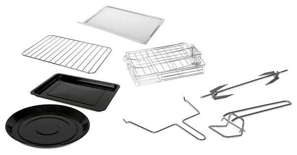 | В комплекте : | вертел, держатель для противня/решётки, круглый противень, поддон для сбора крошек, противень, решётка, ухват |