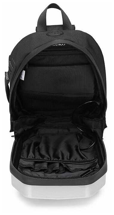 - + Удобный небольшой рюкзак. Из-за пластмассовой крышки хорошо держит форму, оригинален. Внутри много кармашков, два на молнии. Попробовала, в мягкое отделение влезает мой планшет 10 дюймов.