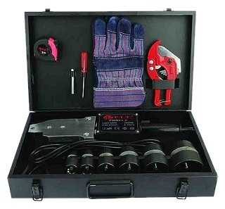 - + Сам паяльник выглядит довольно неплохо,полная комплектация,рулетка, отвёртка,шестигранник, 6 пар насадок,перчатки.Труборез немного слабоват, трубку 25го диаметра режет хорошо, но надо приложить усилие.