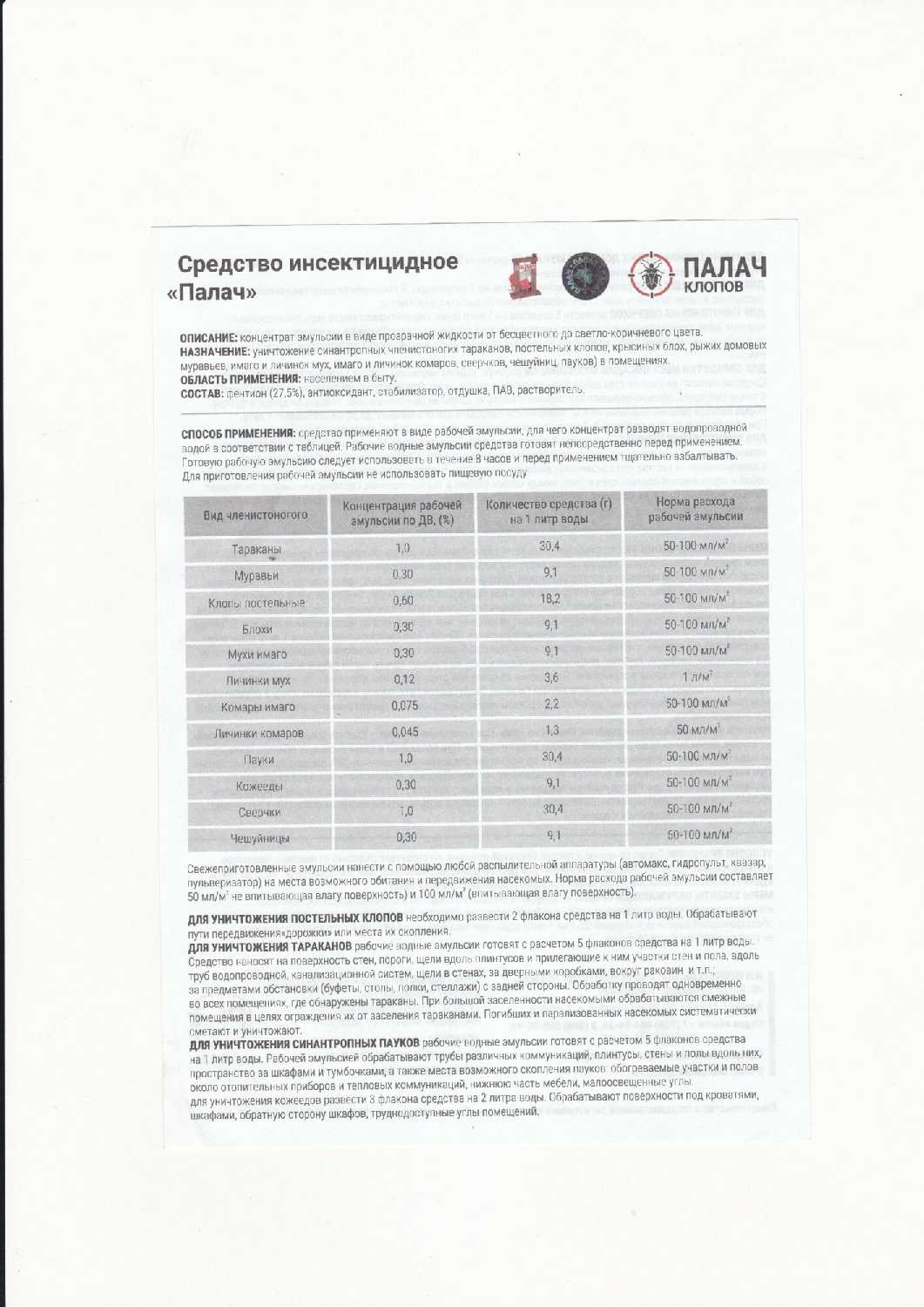 | Способ применения : | флакон размешать на 0, 5 л. воды и на 5 м. кв. побрызгать стены шкафы одежду из брызгалки . |