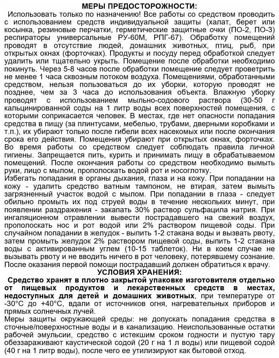 Обязательно использование респиратора (например, класса 3М), перчаток и защитной одежды для исключения контакта с кожей и дыхательными путями. Во время обработки и последующего проветривания (4-5 часов) в помещении не должны находиться люди, дети и домашние животные. После процедуры поверхности, с которыми возможен контакт, моют содовым раствором. -