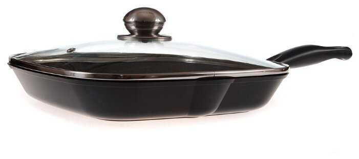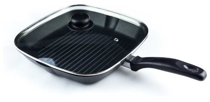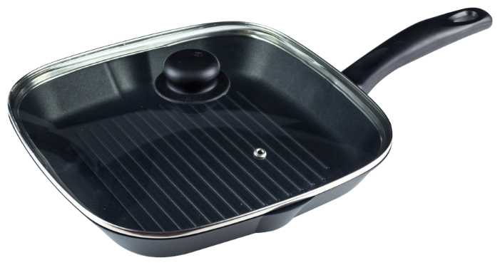 - + Плотный металл. Антипригарное покрытие. Крышка