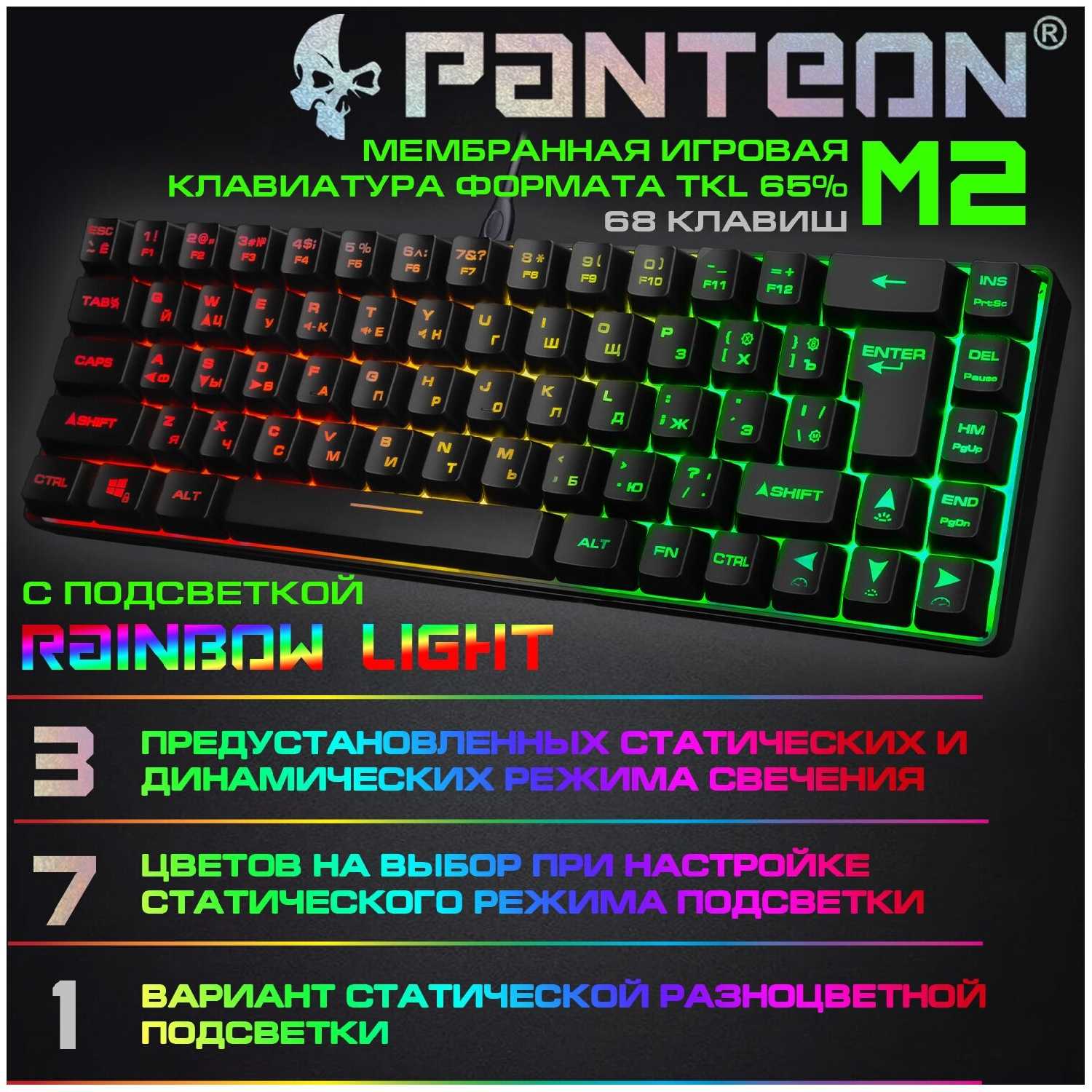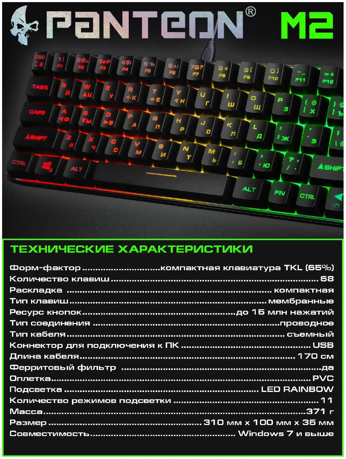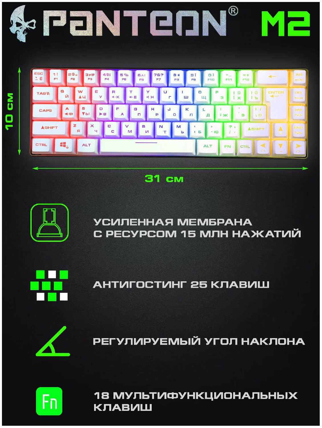 - Мембранные переключатели обеспечивают мягкое нажатие с низким уровнем шума (кроме пробела и Enter).