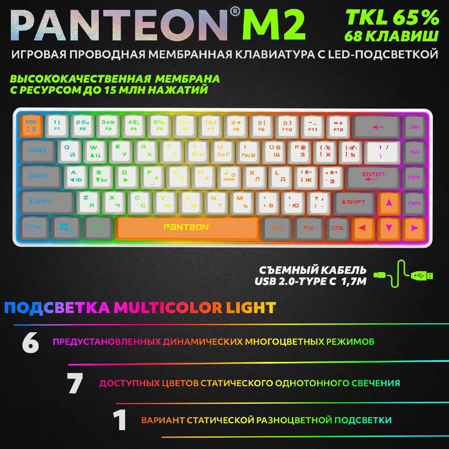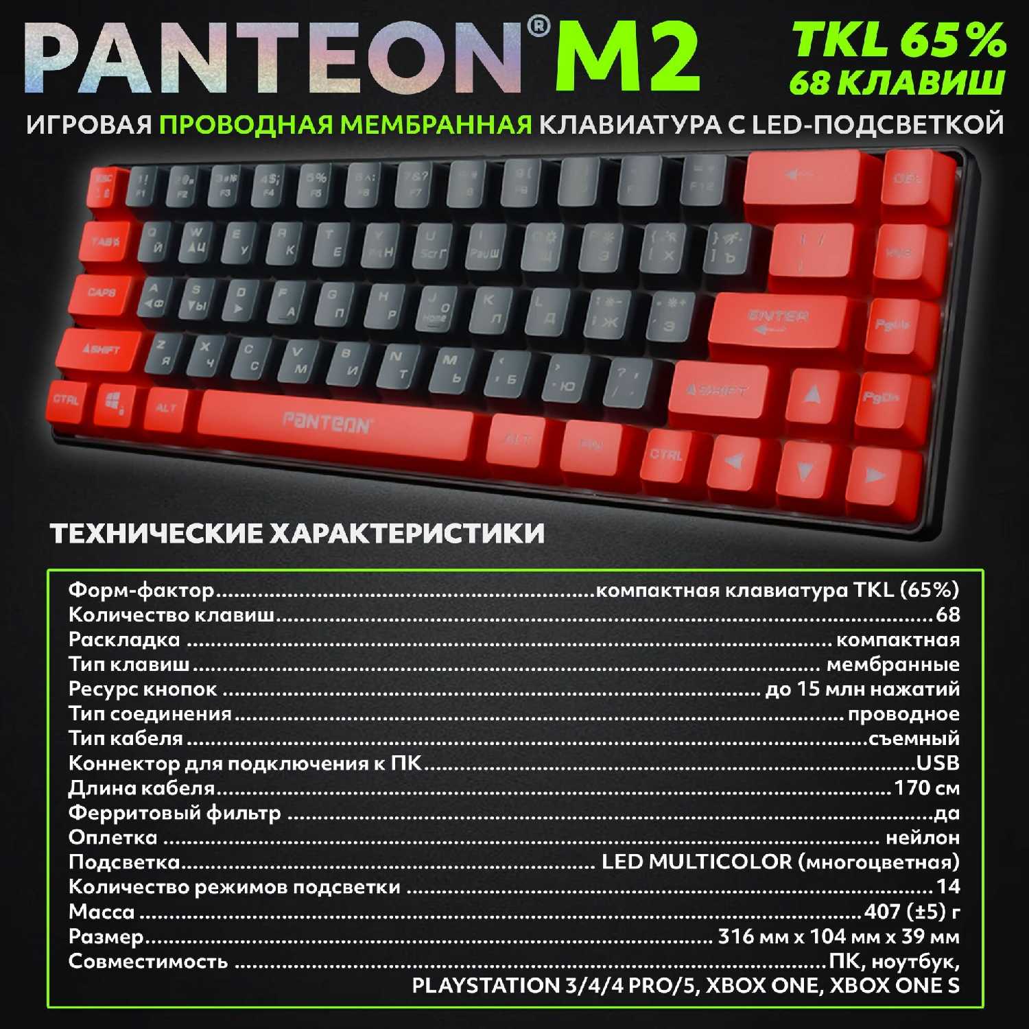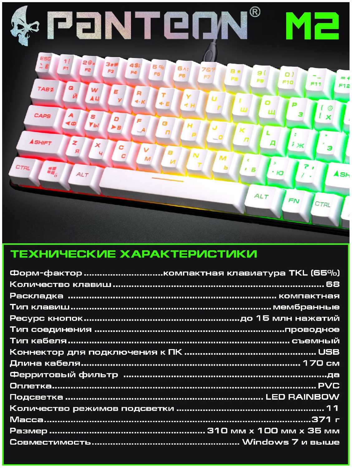 - Мембранные переключатели обеспечивают мягкое нажатие с низким уровнем шума (кроме пробела и Enter).