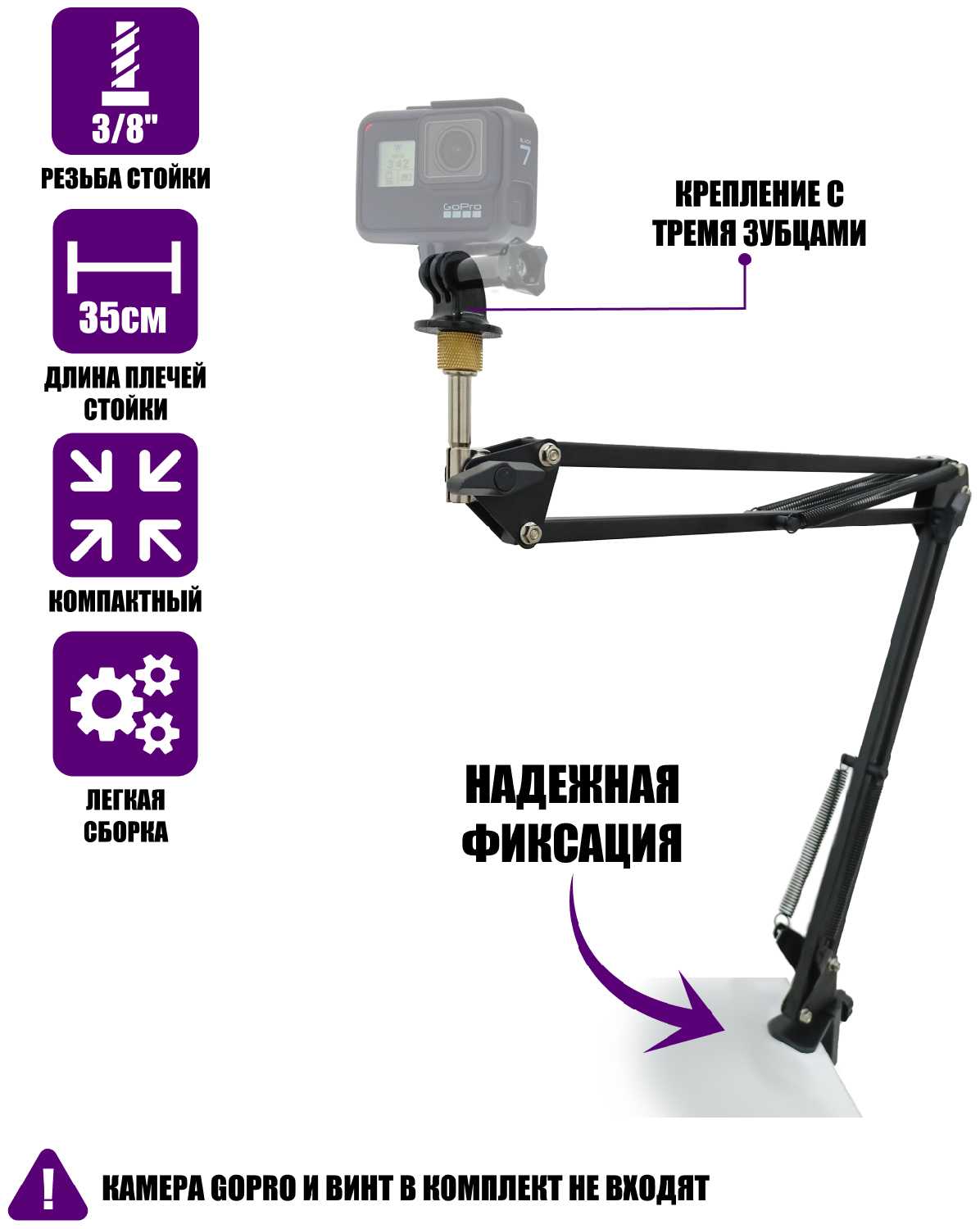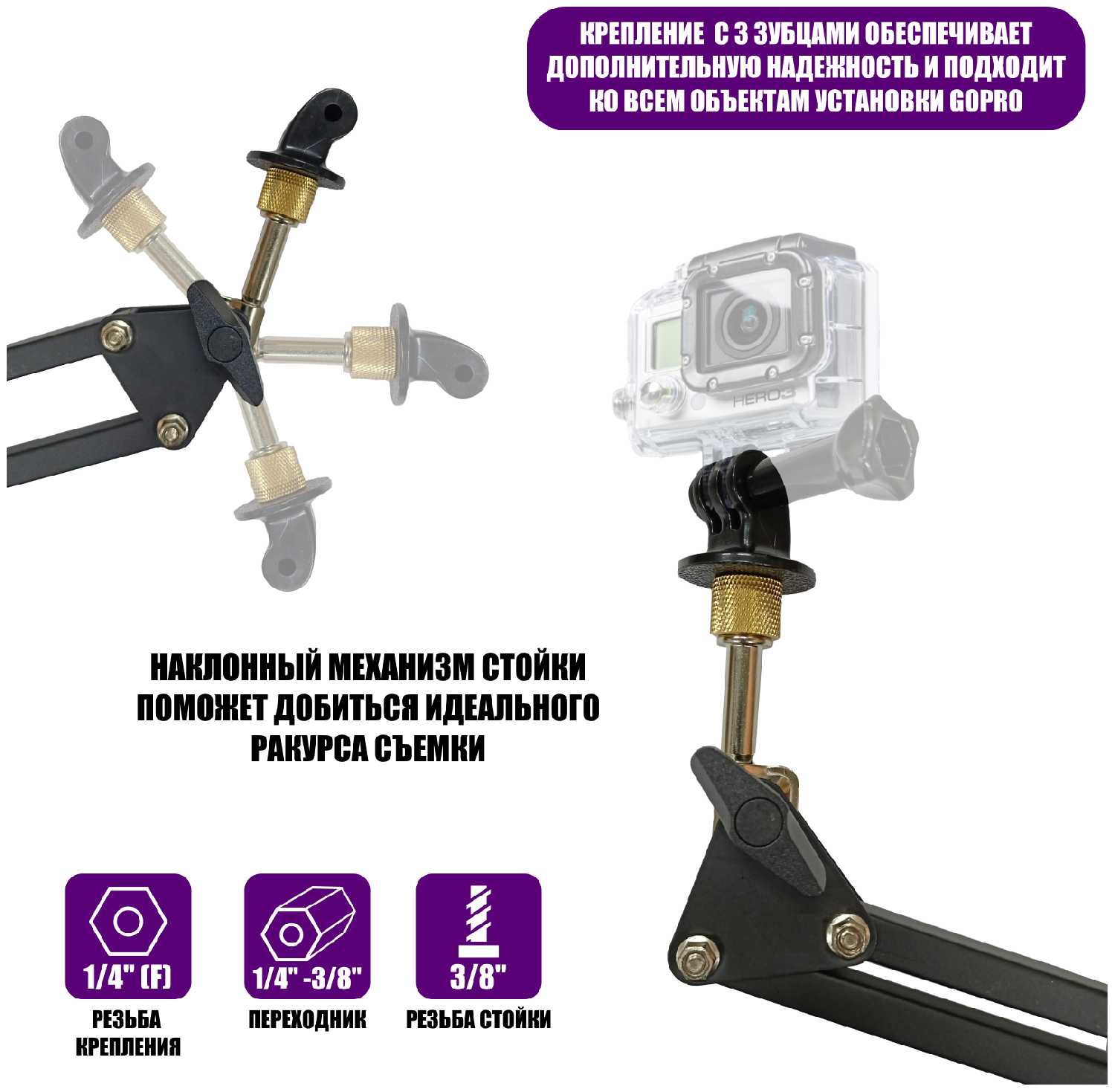 | Комплектация : | Стойка пантограф NB - 1 шт. - Струбцина - 1 шт. - Крепление с гайкой для камеры GoPro - 1 шт. - Переходник с 3/8" на 1/4" – 1 шт. |