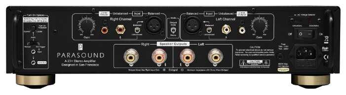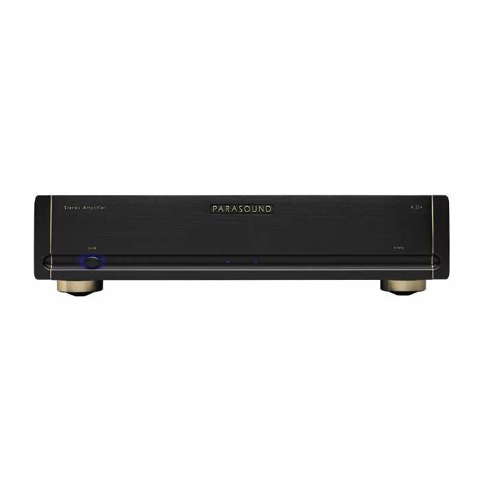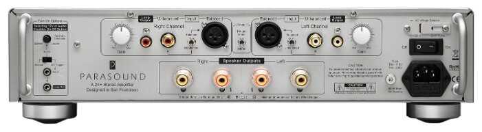 - + Выигрывает у конкурентов Parasound A 23 и за большую цену.Звучит мощно,с глубоким низом,очень динамичный звук.Звучание у Parasound A 23 приятное не зря сертификат thx2.Главное это балансные входы и мощность 220 ват на канал!!!