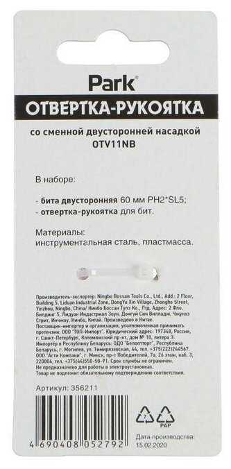 | Дополнительная информация : | размер двусторонней биты: 60 мм, материал биты: инструментальная сталь, тип бит: PH2 и SL5, материал рукоятки: пластмасса, упаковка: одинарный блистер. |