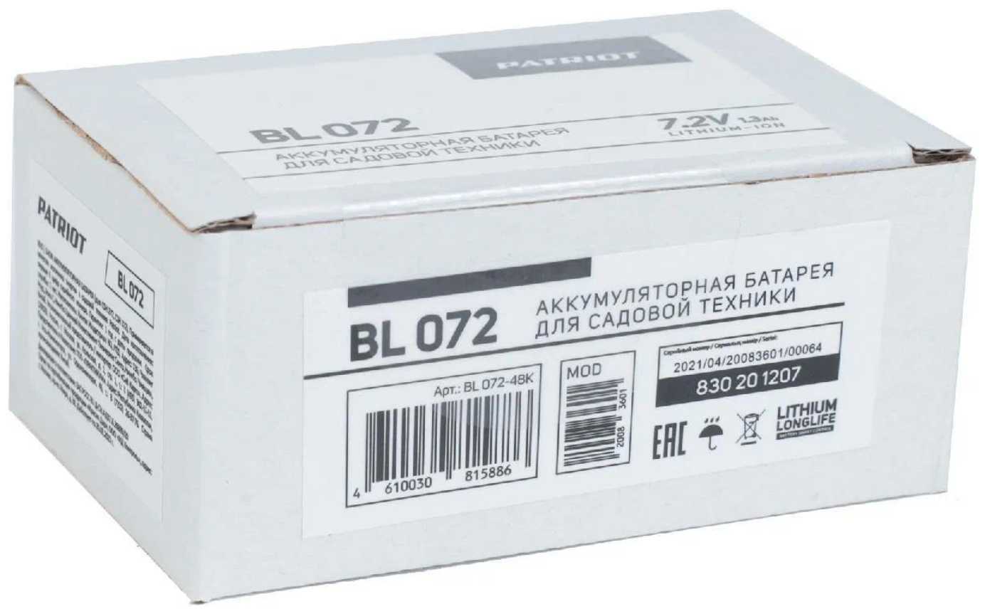 | Дополнительная информация : | Аккумулятор Patriot 830201207, 7.2 В Li-Ion 1.3 Ач |