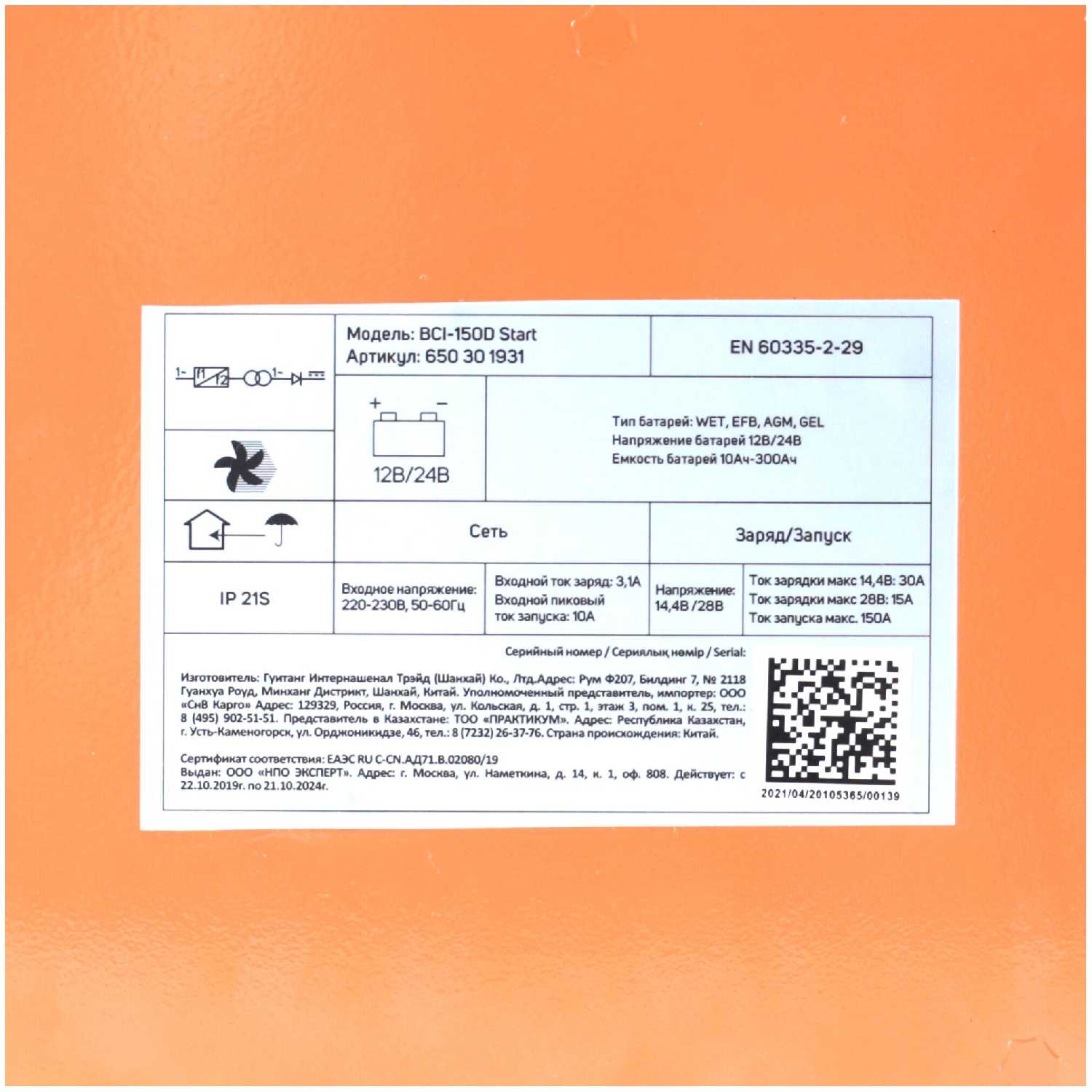 | Дополнительная информация : | 4-ступенчатое автомобильное зарядное устройство, которое подходит для зарядки и подзарядки свинцово-кислотных аккумуляторов номинальным напряжением 12В или 24В с жидким электролитом (WET), необслуживаемых аккумуляторов (MF, EFM, EFB), клапанных, абсорбирующих стекловолоконных (AGM) и большинства гелиевых (GEL) АКБ. Совмещают все преимущества электронных зарядных устройств и мощных трансформаторных пусковых Зарядка разных типов батарей Большой диапазон и плавная установка тока Режим восстановления и электронная защита Запуск автомобиля током до 150 Ампер |