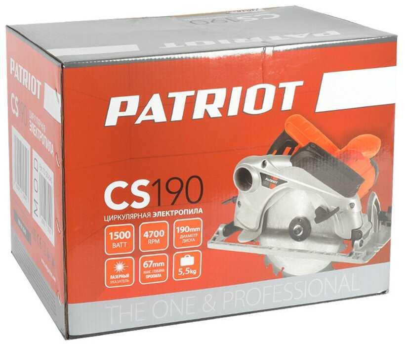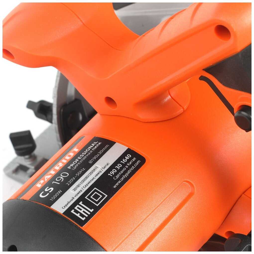 | Дополнительная информация : | настройка угла пропила без инструмента - для простоты использования, Возможность подключения пылесоса - для сохранения чистоты на рабочем месте, Защита подшипников от пыли - для долгого срока службы, Лазерный указатель - для точности реза, Система быстрой замены щёток облегчает эксплуатацию прибора, Покрытие рукоятки ExtraGrip - для предотвращения скольжения, Прорезиненный морозостойкий кабель - для использования PATRIOT CS 190 190301640 на улице |