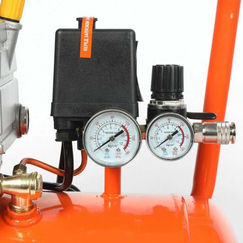 Уровня масло в компрессоре минимальный, сразу надо докупать масло и менять на новое. Качество аксессуаров в комплекте ославляет желать лучшего- травит воздух по фитингам.