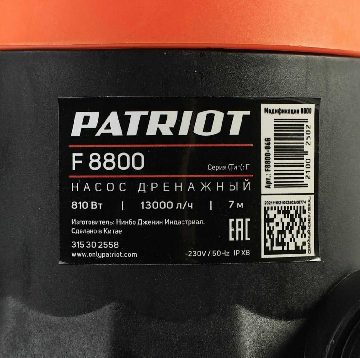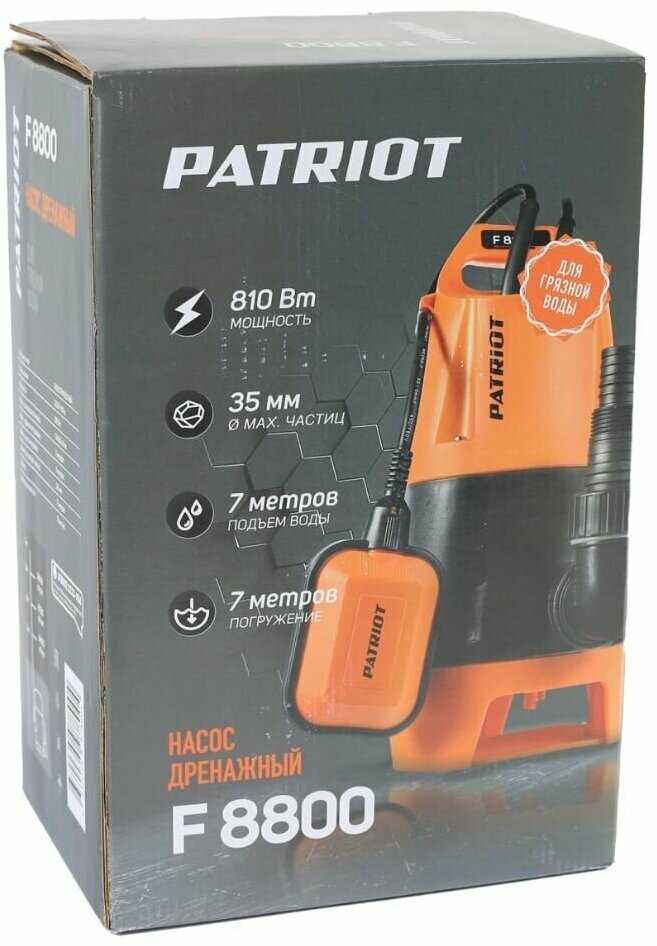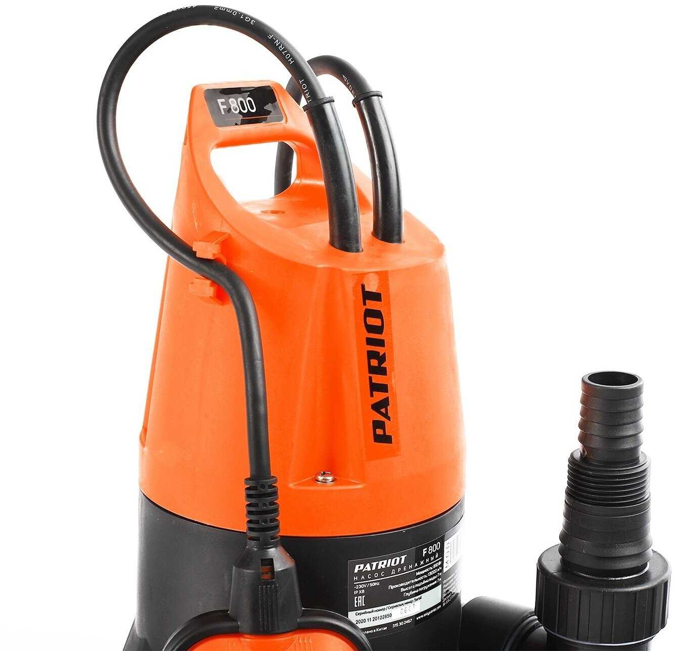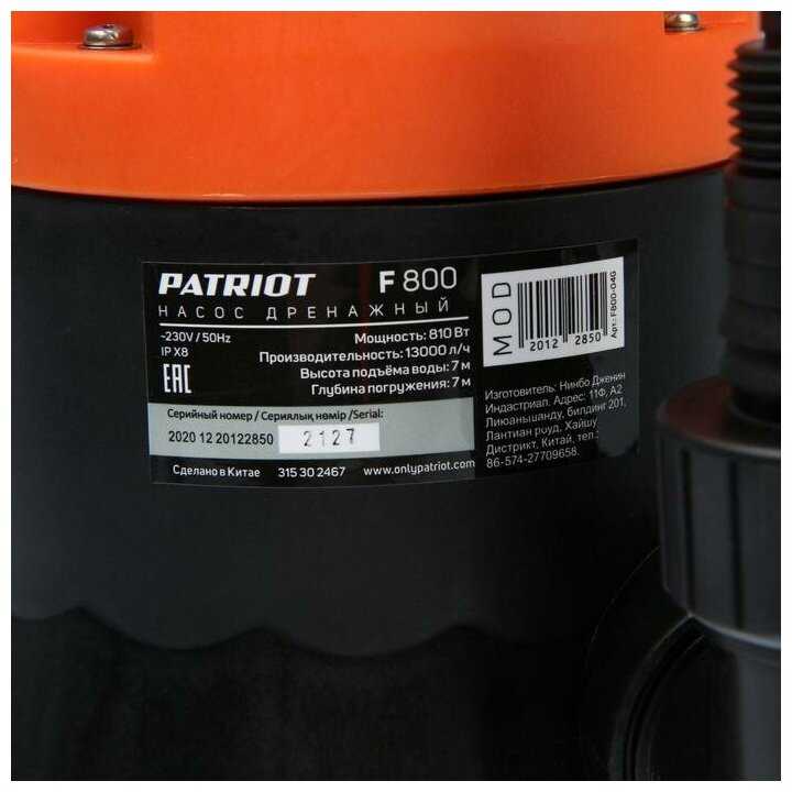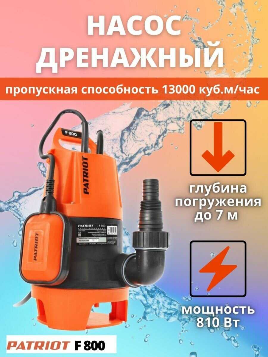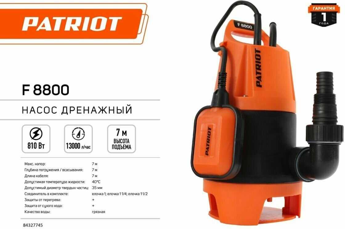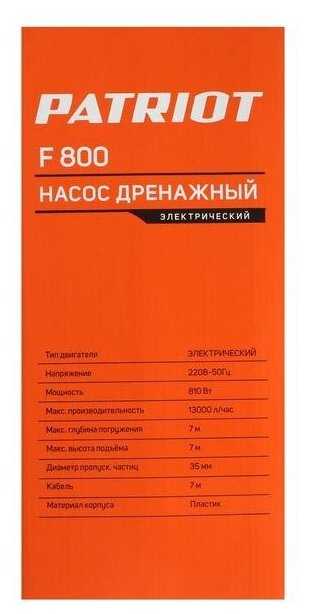 Дополнительная информация : | Насос дренажный PATRIOT F 800, для грязной воды, 810 вт, 13000 л/ч |
