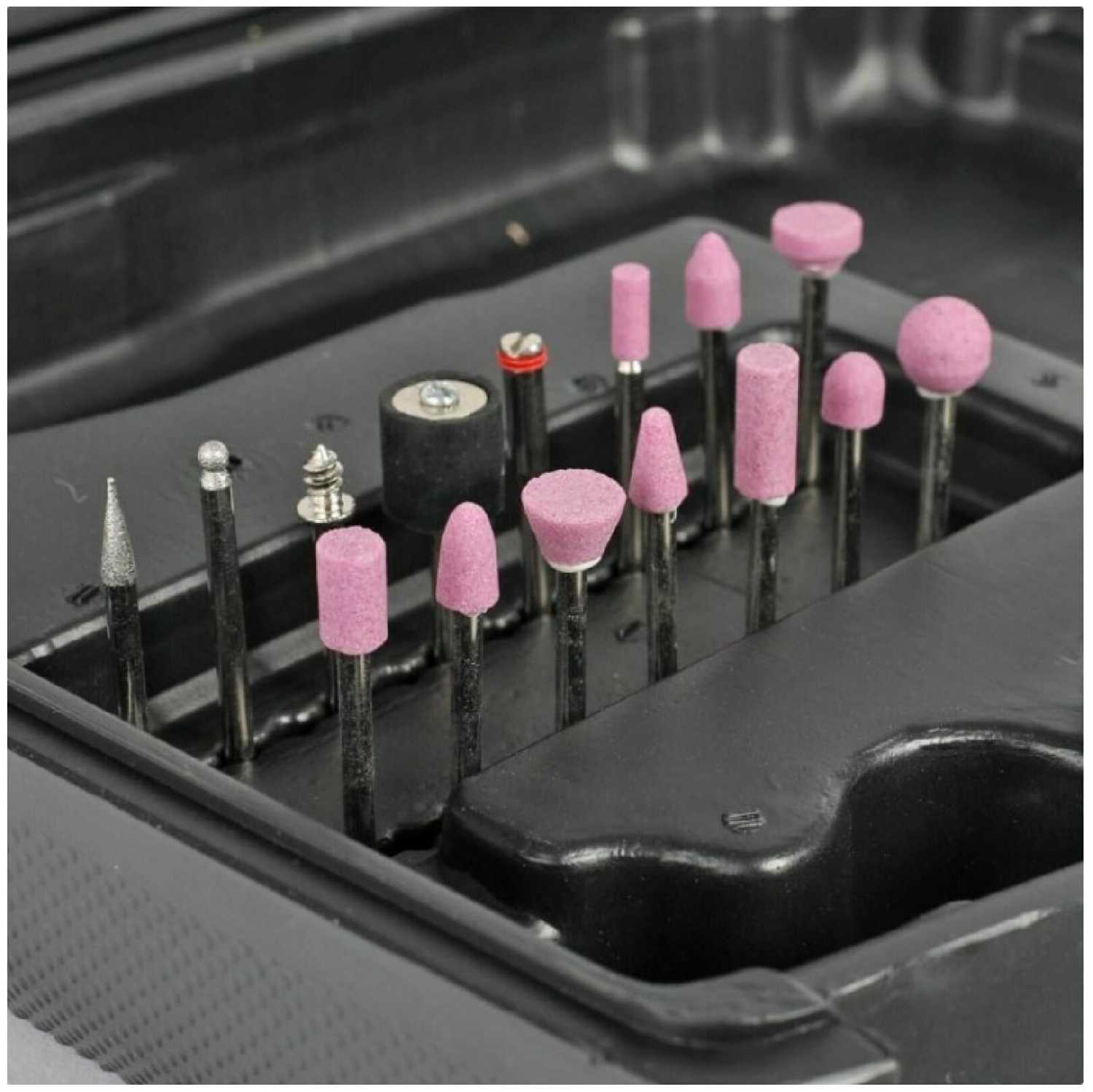 | Дополнительная информация : | Тип двигателя щеточный, Мощность 140 Вт, Размер цанги 2.3, 3.2 мм, Частота вращения шпинделя 10000-32000 об/мин, Электронная регулировка оборотов есть, Гибкий вал в комплекте да, Упаковка чемодан/кейс, Кол-во аксессуаров в комплекте 40 шт |