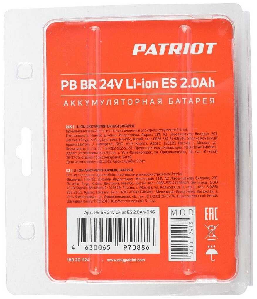 | Дополнительная информация : | Аккумулятор Patriot PB BR 24V Li-ion, 24 В Li-Ion 2 Ач |