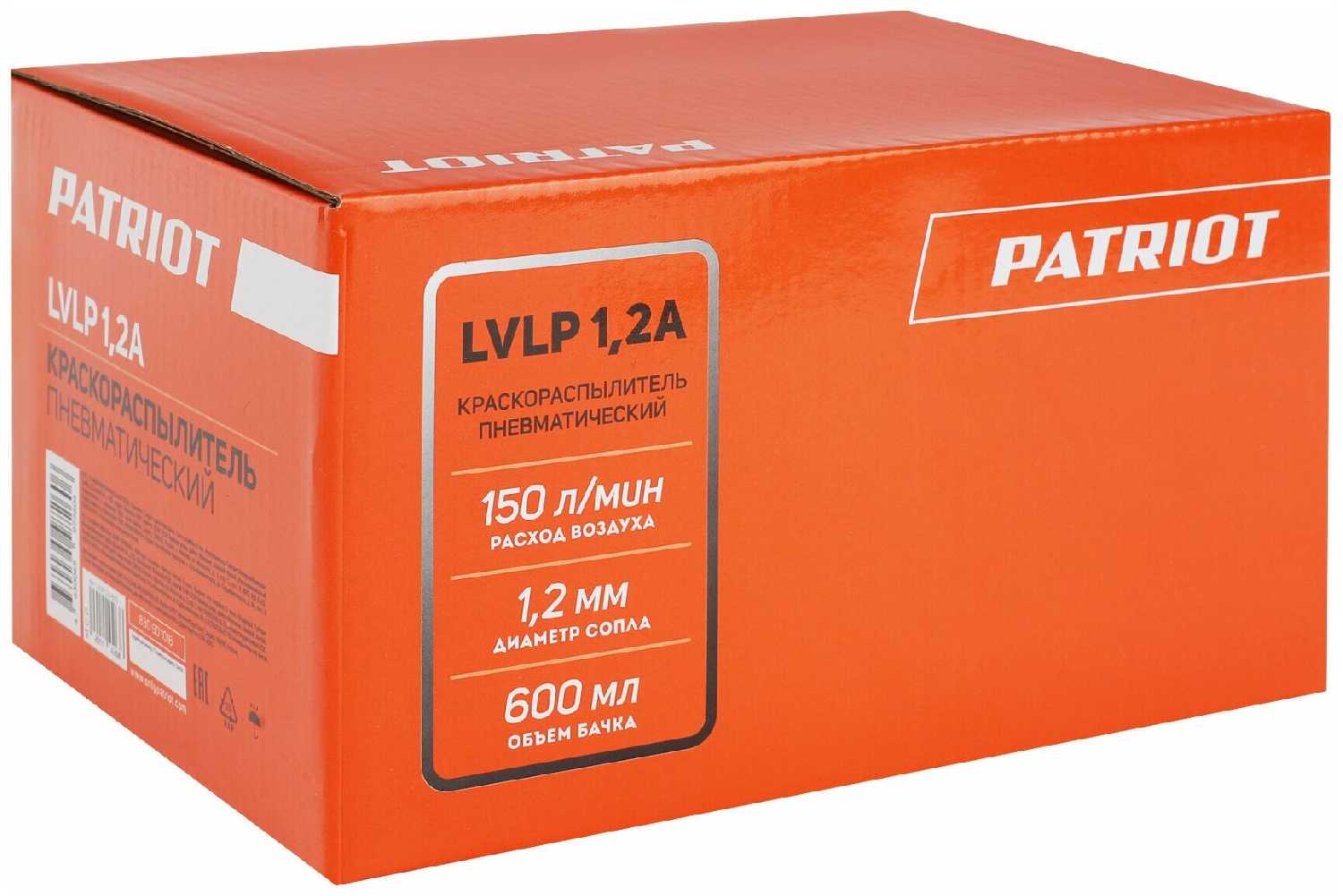 | Дополнительная информация : | профессиональный пневмокраскораспылитель PATRIOT LVLP 1, 2A, в/б, 0.6 л, сопло 1, 2 мм, 150 л/мин, быстросъем 1/4" |