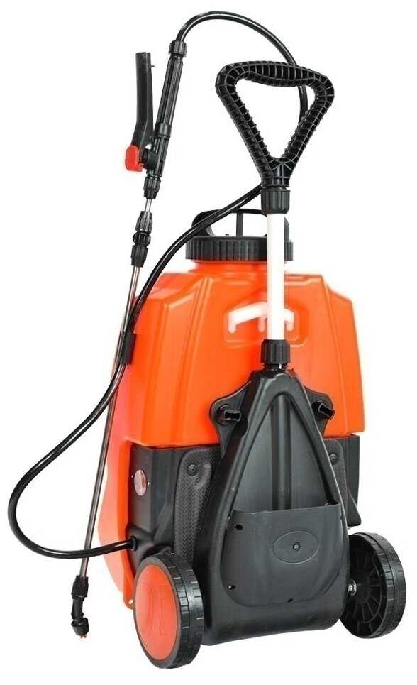 При полной загрузке бака (16 литров) общий вес превышает 20 кг, что делает аппарат довольно громоздким. Тележка облегчает перемещение по ровным поверхностям, но для переноски по участку с неровным рельефом конструкция оказывается неудобной. Аккумулятор свинцовый, что добавляет веса по сравнению с литиевыми аналогами, но обеспечивает достаточную емкость для длительной работы.