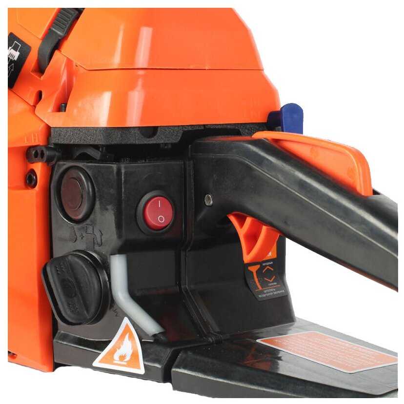 Широкая клавиша мгновенного отключения зажигания расположена эргономично – до нее легко дотянуться пальцем в экстренной ситуации. Цепь останавливается за 0.3-0.5 секунды после отпускания курка, что отмечается как критически важный фактор при работе в саду.