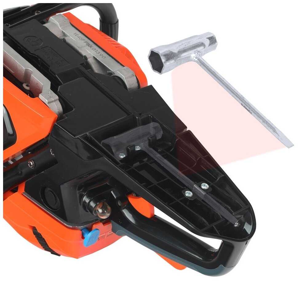 - + Мощная, лёгкий старт двигателя, свечной ключ -отвёртка крепится с нижней части рукояти, надёжное крепление щитка тормоза цепи, регулировка натяжения цепи с бока.