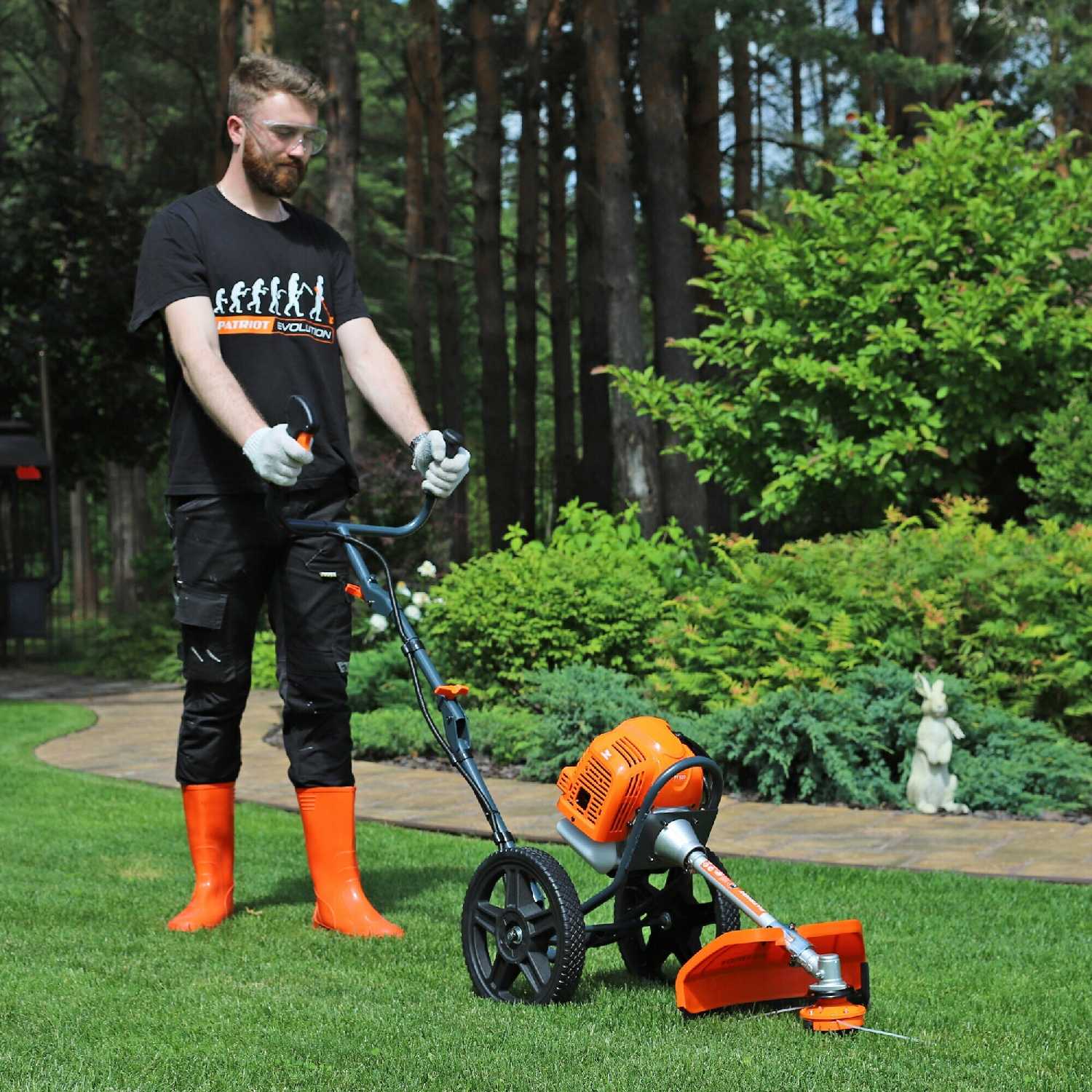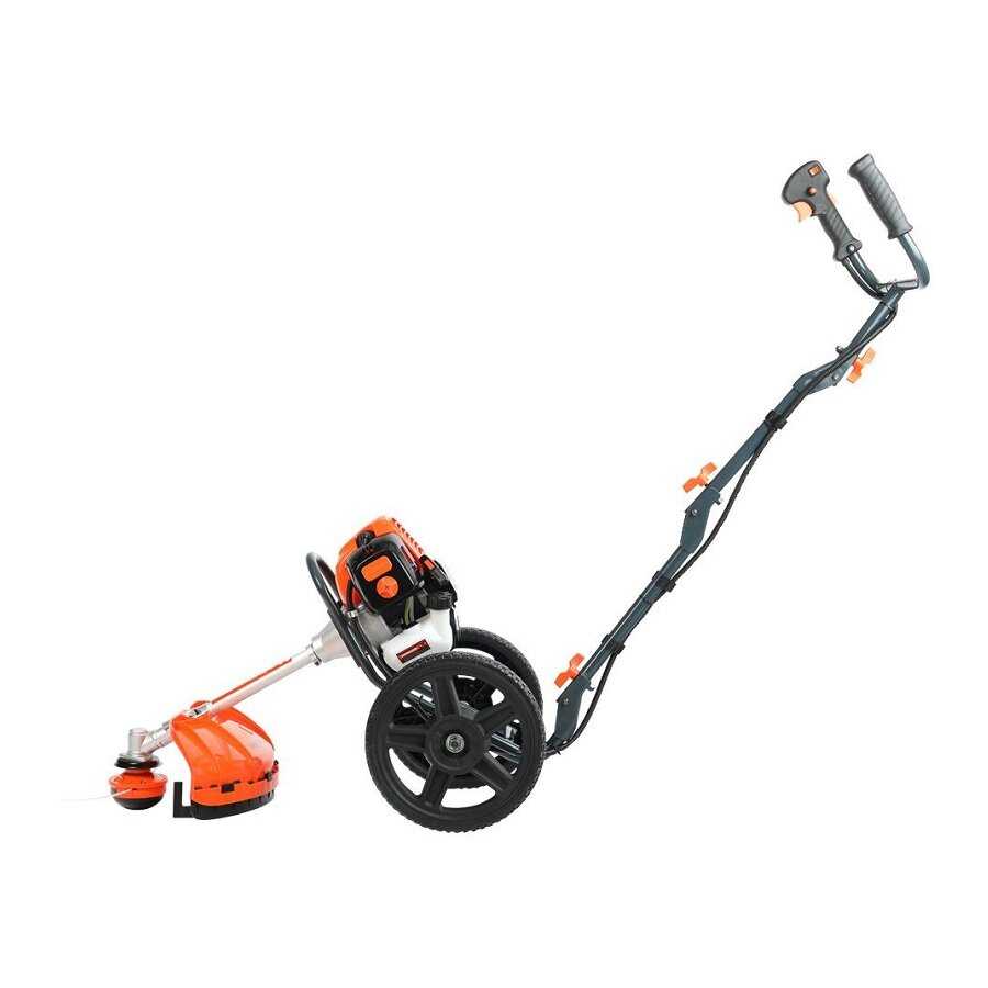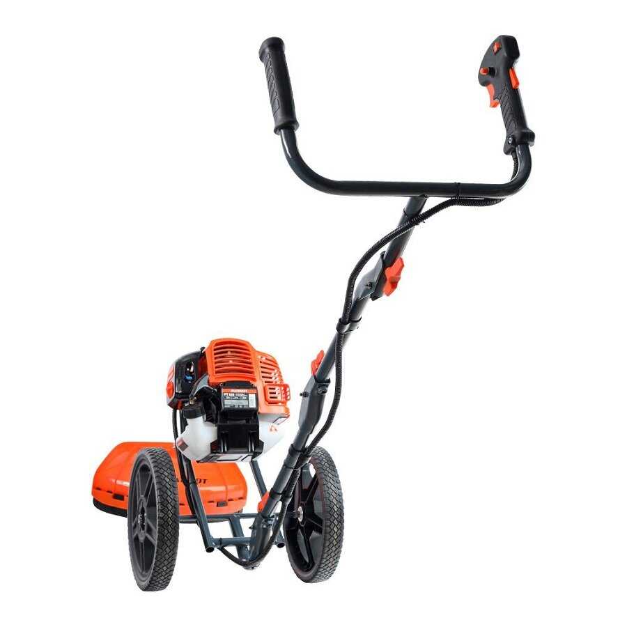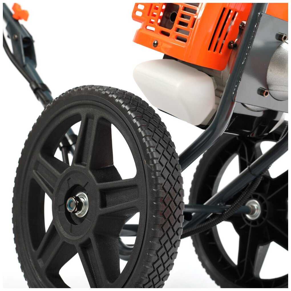 - + Нагрузка от тримера распределяется на большие колеса и часть на ручку. Масса практически не ощущается. Качество сборки понравилось. удобная складная ручка. Заводиться с одного рывка.
