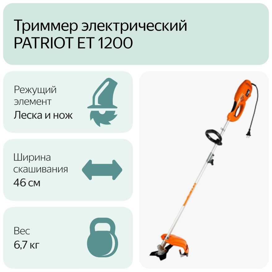 01.07.2024.г приобрёл Триммер электрический Patriot ET 1200 Двигатель мощный и на этом Всё. Катушка с леской режет защитный кожух при длине лески 14 см. Полный брак. На сайте все отзывы о Триммер электрический Patriot ET 1200 старой комплектации у неё защитный кожух крепится на редукторе и диаметр покоса 46см. На эти отзывы повёлся. А у новой комплектации защитный кожух крепится на скобе, которая крепится клёпкой на штанге, при этом расстояние до ножа всего 14см, а до кожуха 12см, леска режет траву вместе с кожухом и диаметр покоса где-то 32см. Хотел вернуть по гарантии , но при первом использовании задел забор и получил трещинку на корпусе- не гарантийный случай. Похоже либо скоба стоит не правильно, либо кожух косой, или катушка с леской стоит не правильно. Приходится держать длину лески 12см. КАТЕГОРИЧЕСКИ НЕ РЕКОМЕНДУЮ К ПОКУПКЕ!