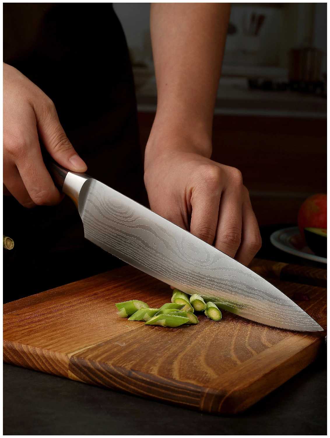 - Лазерная гравировка на клинке не только имитирует дамасский узор, но и снижает трение при резке, предотвращая «залипание» пищи.
