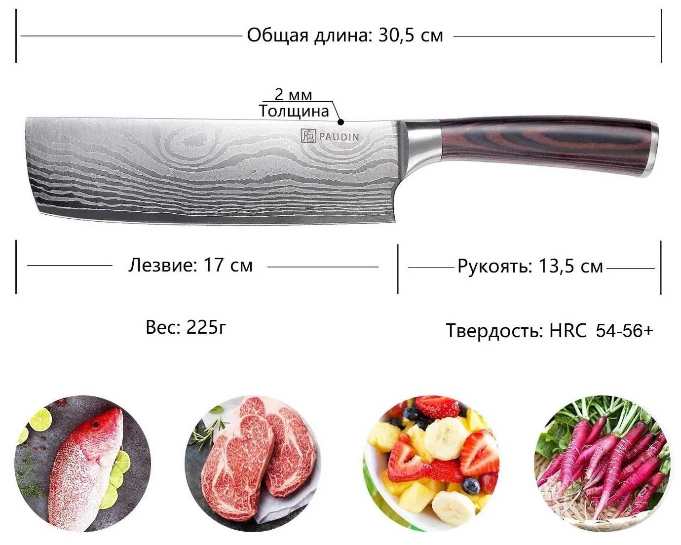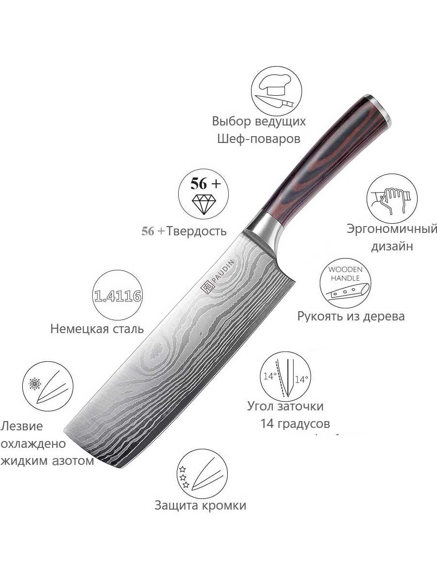 - + удобный в руке, острый, овощи и мясо можно прям тоненько нарезать, отличная упаковка подарочная и просто чтобы возить с собой, пластиковые ножны тонкие в комплекте, очень удобно.