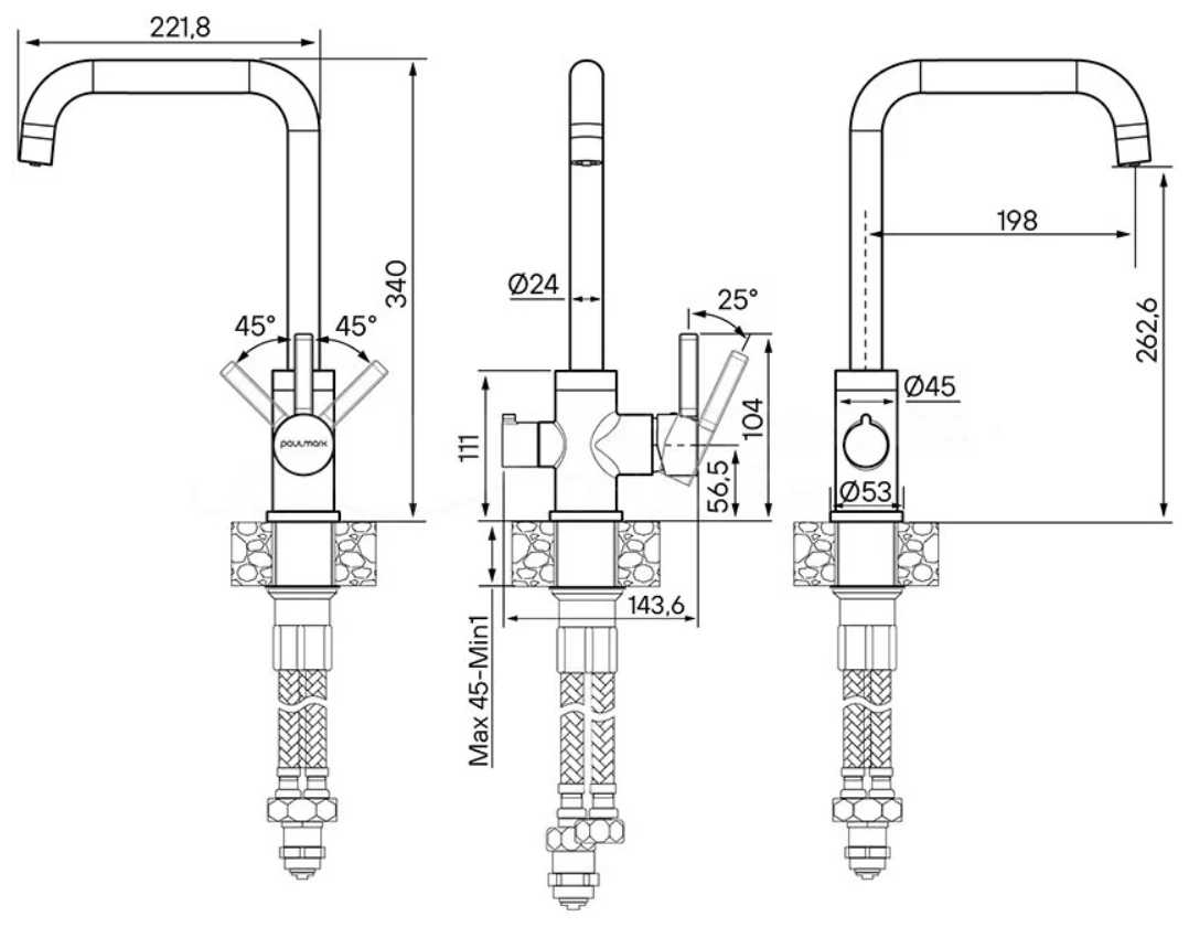 - - Комплектные шланги короткие (40см) с пластиковой оплеткой. Непонятно как аэратор со временем менять.