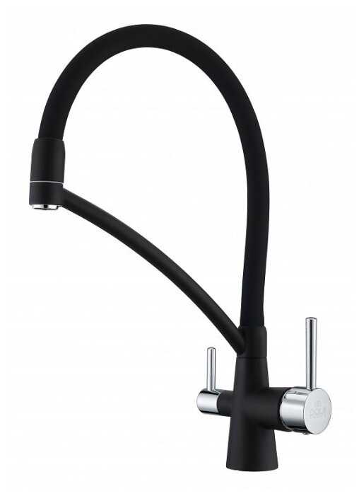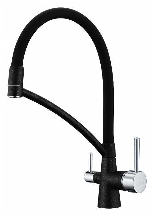 Очень красивый смеситель с гибким изливом. Большая часть сделана в черном матовом цвете и только регуляторы покрыты хромом. Смотрится здорово и хорошо вписывается в интерьер кухни. За ним очень легко ухаживать, черное покрытие не дает каплям на нем оставаться и оставлять следы белого налета, протираю его редко так как часто просто не нужно. Излив гибкий, прочный, крутится и гнется во все стороны. Им удобно набирать воду в обычные бутылки, пятилитровки, кастрюли которые рядышком стоят на столе. Когда излив в держателе то высота получается удобная, в раковине поместится гора посуды, также удобно мыть большие кастрюли. В смеситель подключается фильтр, отдельно выводить кран не нужно. Монтируется и подключается просто, монтажный набор имеется.