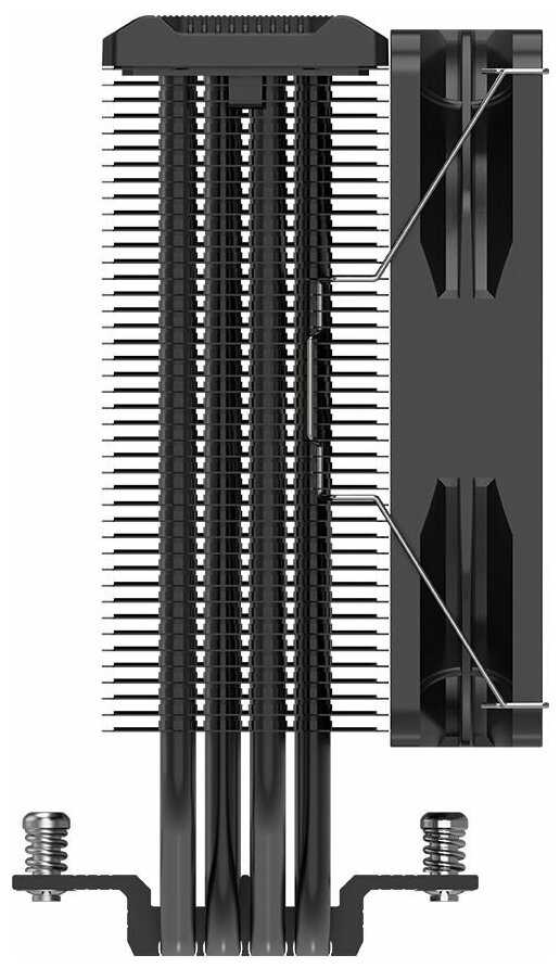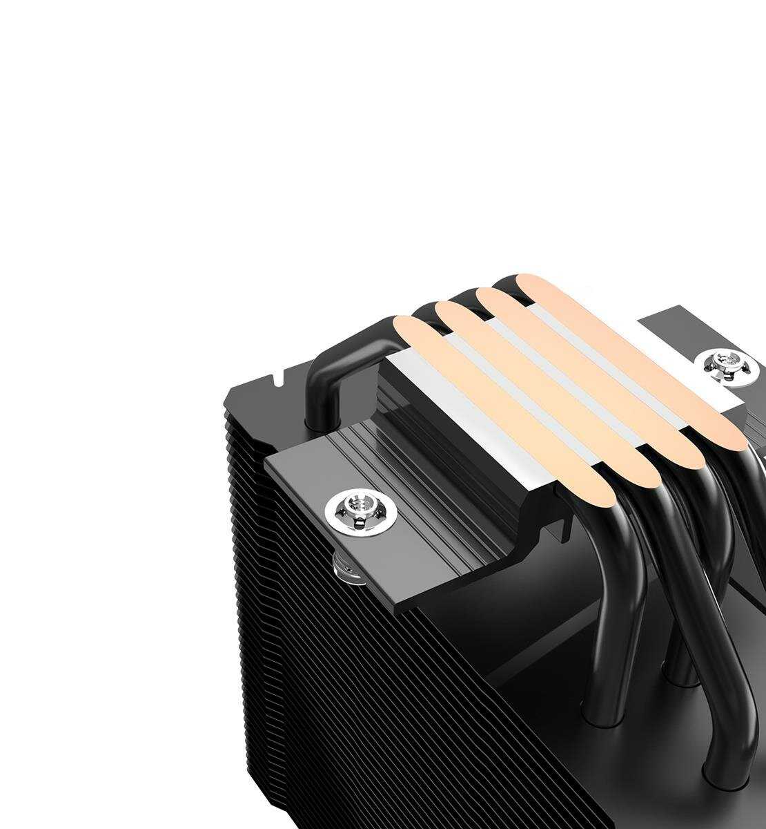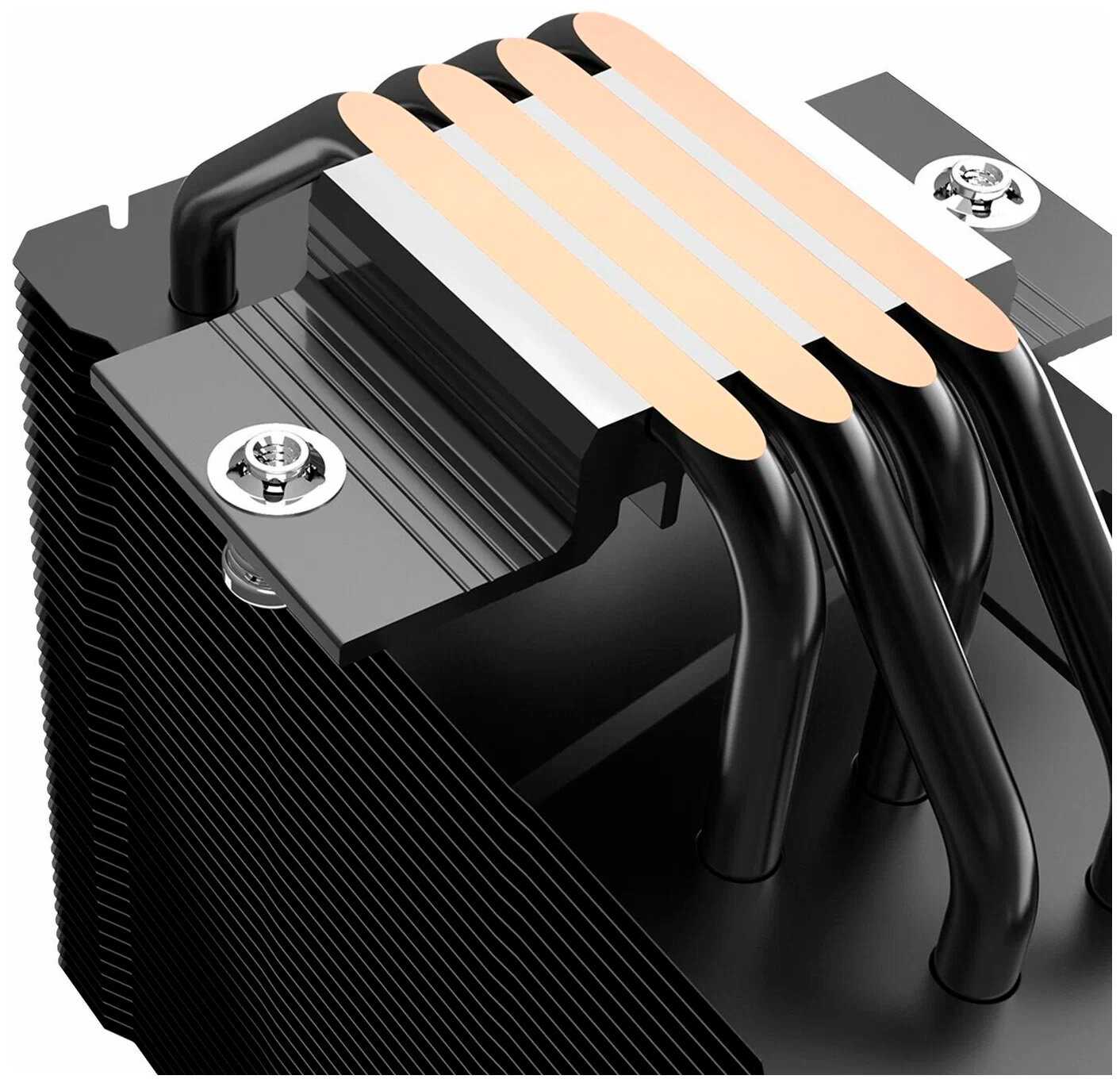 Конструкция включает 5 трубок, но только 3 из них полноразмерные (U-образные), а 2 — укороченные (L-образные), что видно при осмотре основания. Это снижает реальный теплоотвод по сравнению с классическими 5-трубными решениями, особенно на процессорах с неравномерным нагревом ядер. В отзывах подчёркивается, что для чипов TDP >130 Вт (например, Ryzen 7) такой дизайн менее эффективен, чем у аналогов вроде DeepCool Gammaxx 400. -