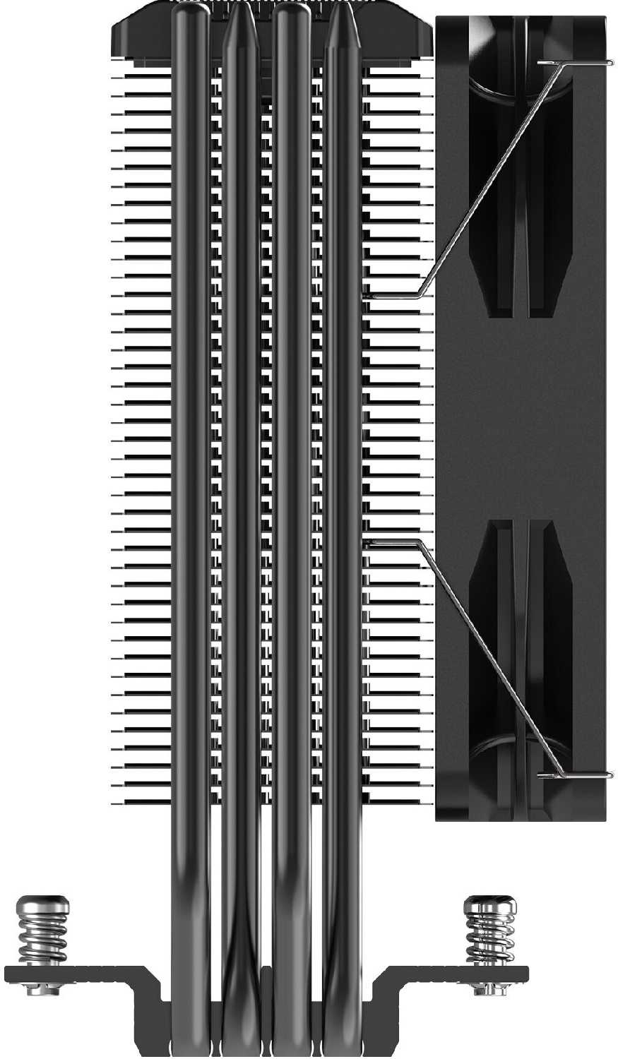 Конструкция включает 5 трубок, но только 3 из них полноразмерные (U-образные), а 2 — укороченные (L-образные), что видно при осмотре основания. Это снижает реальный теплоотвод по сравнению с классическими 5-трубными решениями, особенно на процессорах с неравномерным нагревом ядер. В отзывах подчёркивается, что для чипов TDP >130 Вт (например, Ryzen 7) такой дизайн менее эффективен, чем у аналогов вроде DeepCool Gammaxx 400. -