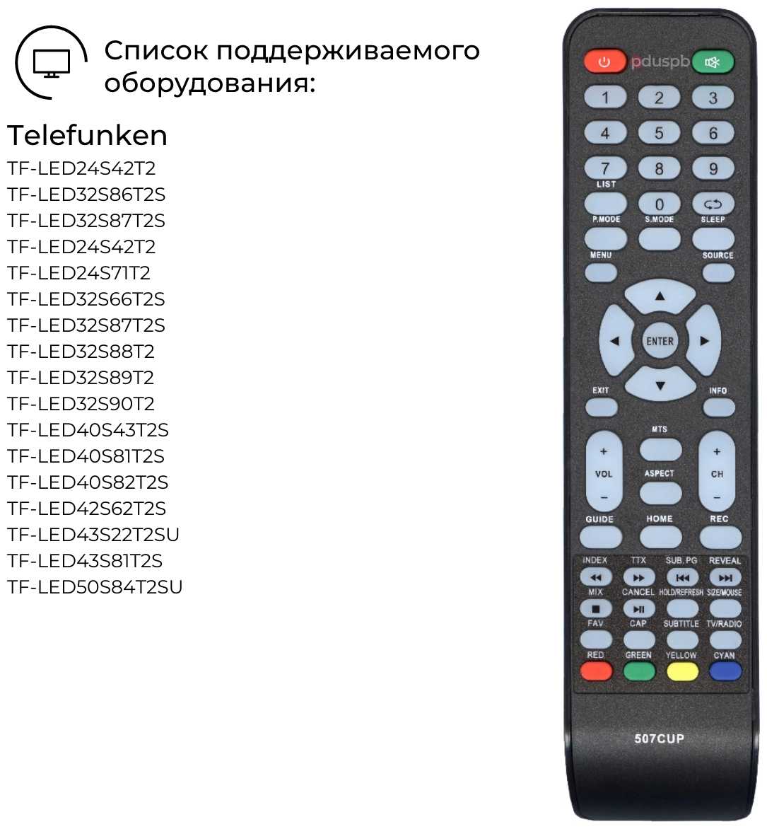 - назначение: для Пульт 507CUP для телевизоров: Telefunken TF-LED24S42T2