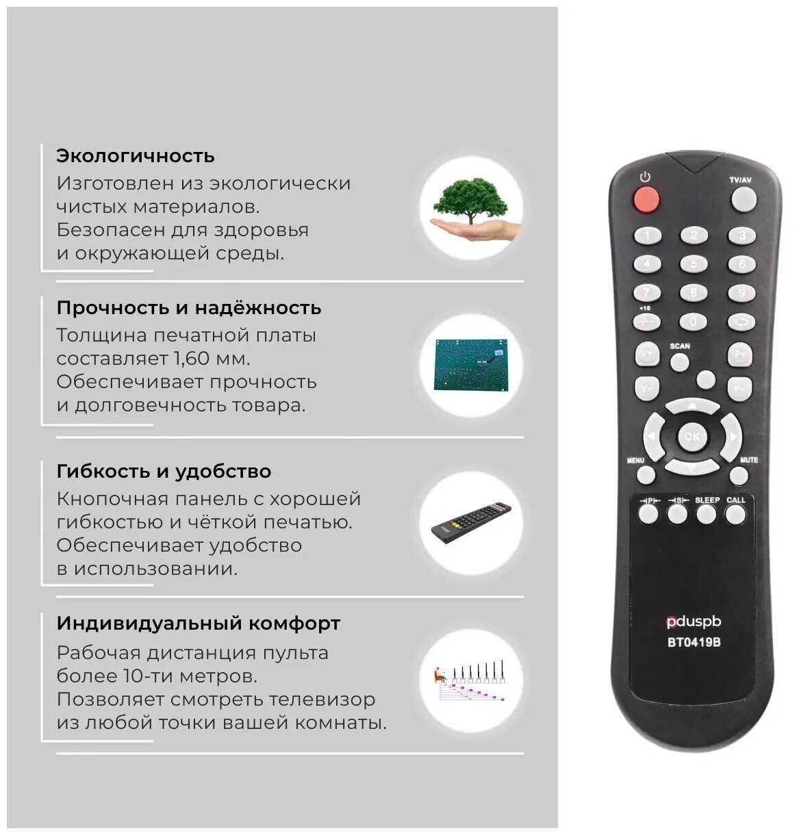 | Дополнительная информация : | Внимание! Данный пульт BT0419B не универсальный. Он совместим только с телевизорами из списка поддерживаемого оборудования! Подробный список поддерживаемого оборудования смотрите в «Назначении». Для Вашего удобства мы также добавили инструкции по подборке пультов. Пожалуйста, ознакомьтесь с ними перед покупкой. Можете задавать вопросы, мы незамедлительно поможем подобрать пульт для Вашего ТВ. |