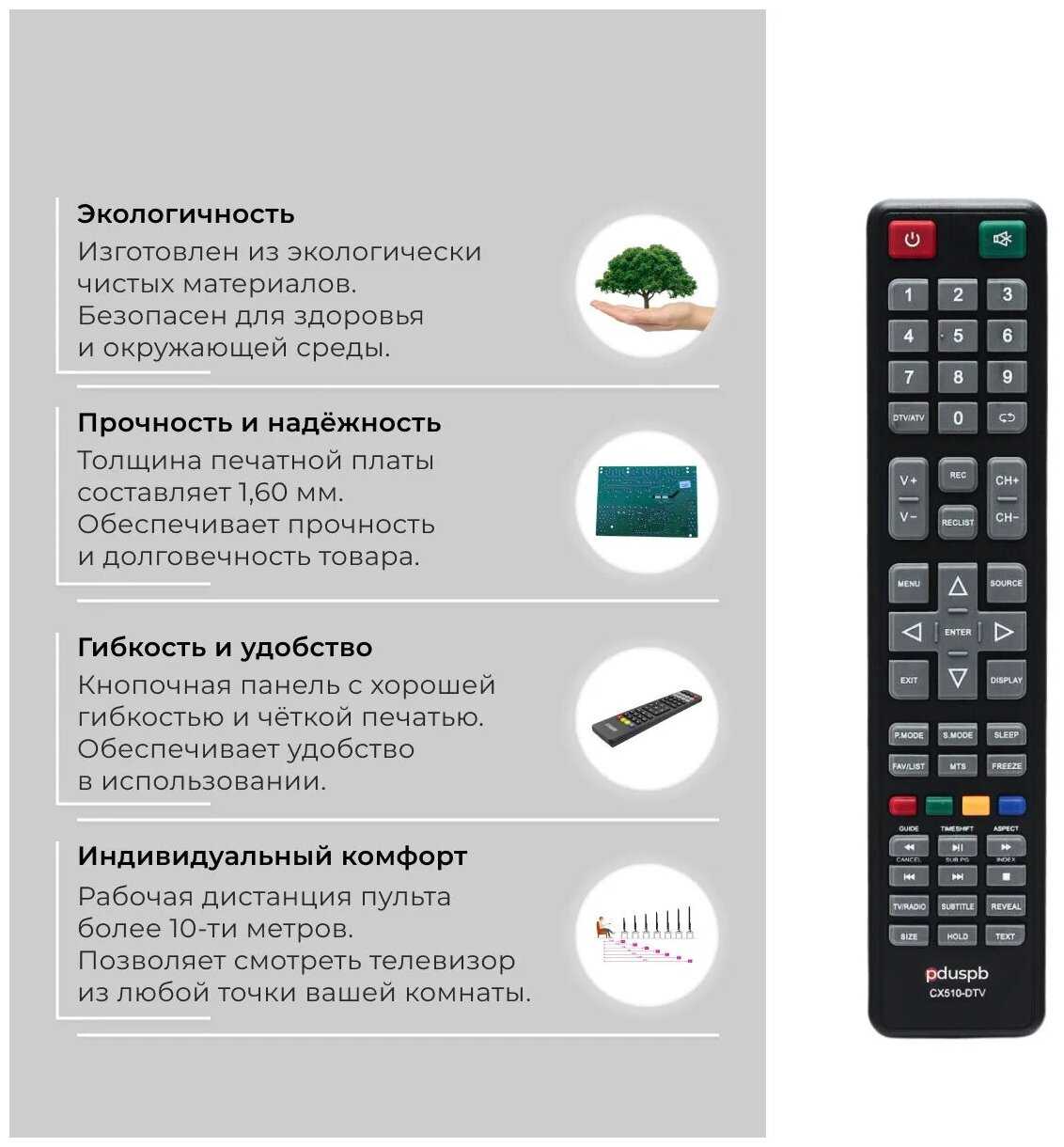 Дополнительная информация : | Внимание! Данный пульт CX510-DTV(5110) не универсальный. Он совместим только с телевизорами из списка поддерживаемого оборудования! Подробный список поддерживаемого оборудования смотрите в «Назначении». Для Вашего удобства мы также добавили инструкции по подборке пультов. Пожалуйста, ознакомьтесь с ними перед покупкой. Можете задавать вопросы, мы незамедлительно поможем подобрать пульт для Вашего ТВ. |