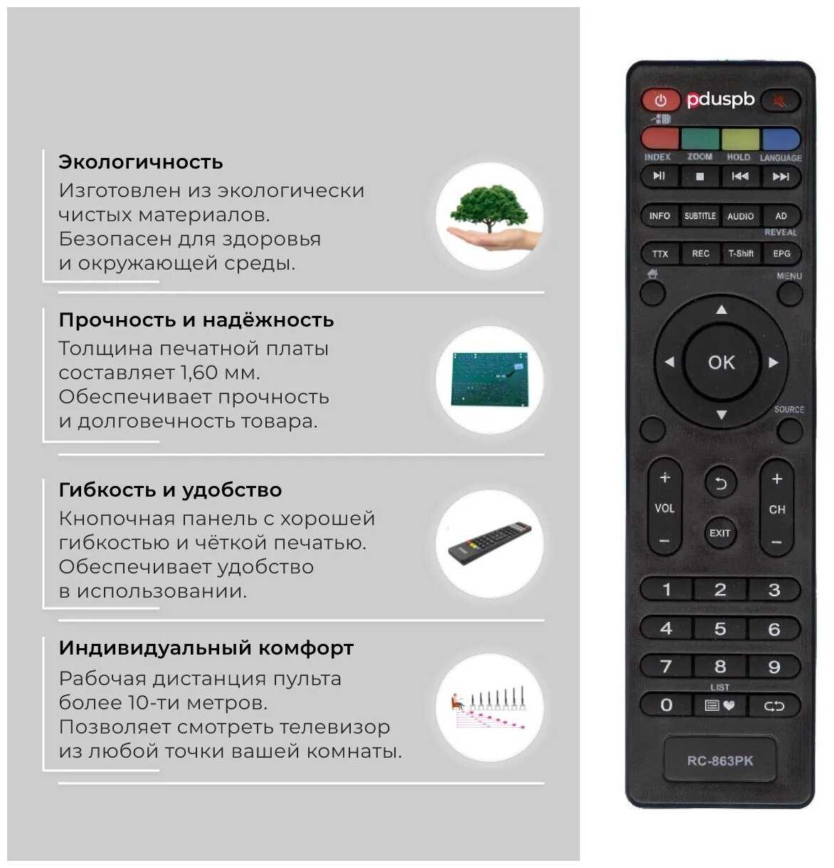 Дополнительная информация : | Внимание! Данный пульт RC-863PK не универсальный. Он совместим только с телевизорами из списка поддерживаемого оборудования! Подробный список поддерживаемого оборудования смотрите в «Назначении». Для Вашего удобства мы также добавили инструкции по подборке пультов. Пожалуйста, ознакомьтесь с ними перед покупкой. Можете задавать вопросы, мы незамедлительно поможем подобрать пульт для Вашего ТВ. |