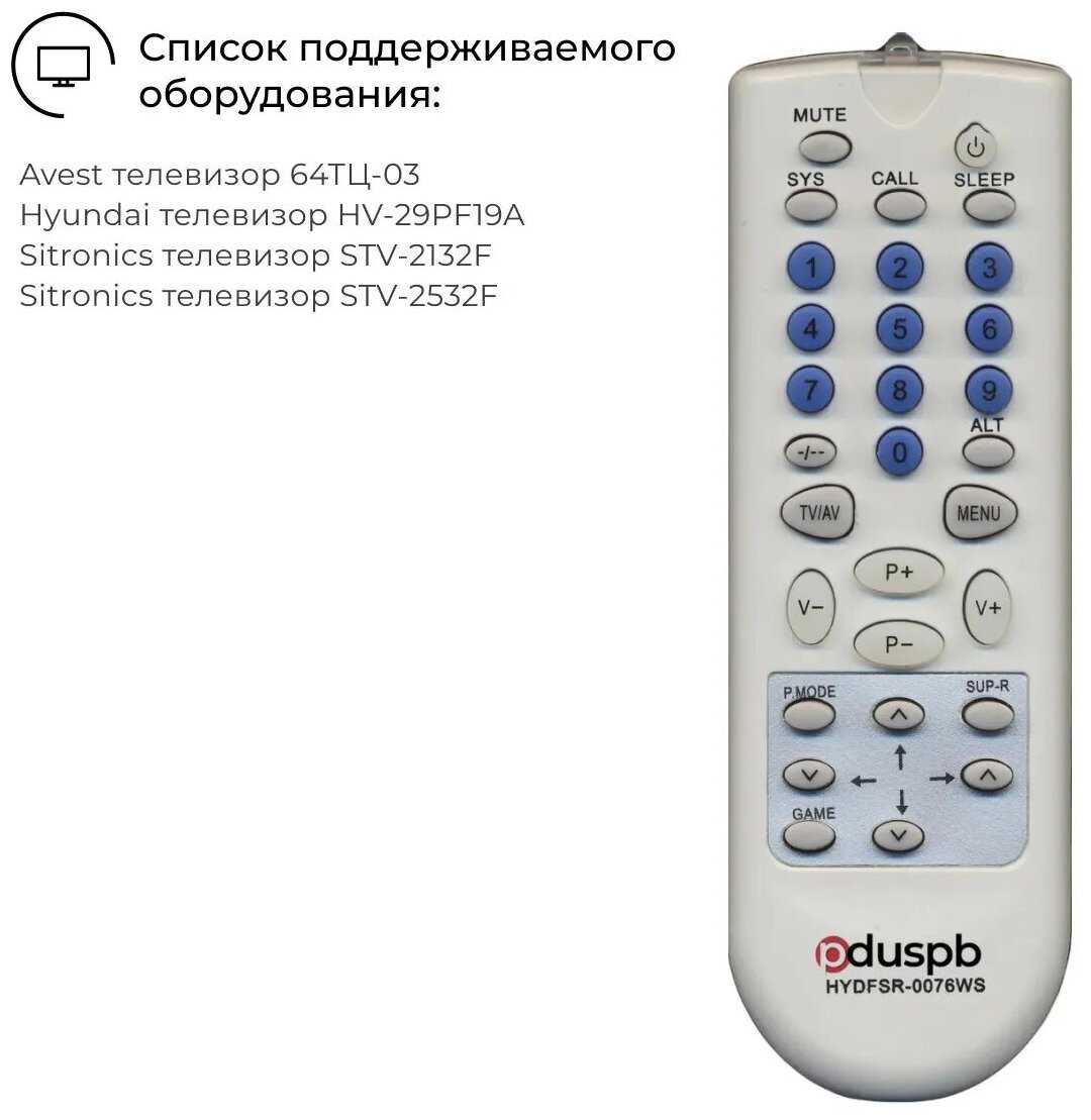 | Дополнительная информация : | Внимание! Данный пульт HYDFSR-0076WS не универсальный. Он совместим только с телевизорами из списка поддерживаемого оборудования! Подробный список поддерживаемого оборудования смотрите в «Назначении». Для Вашего удобства мы также добавили инструкции по подборке пультов. Пожалуйста, ознакомьтесь с ними перед покупкой. Можете задавать вопросы, мы незамедлительно поможем подобрать пульт для Вашего ТВ. |