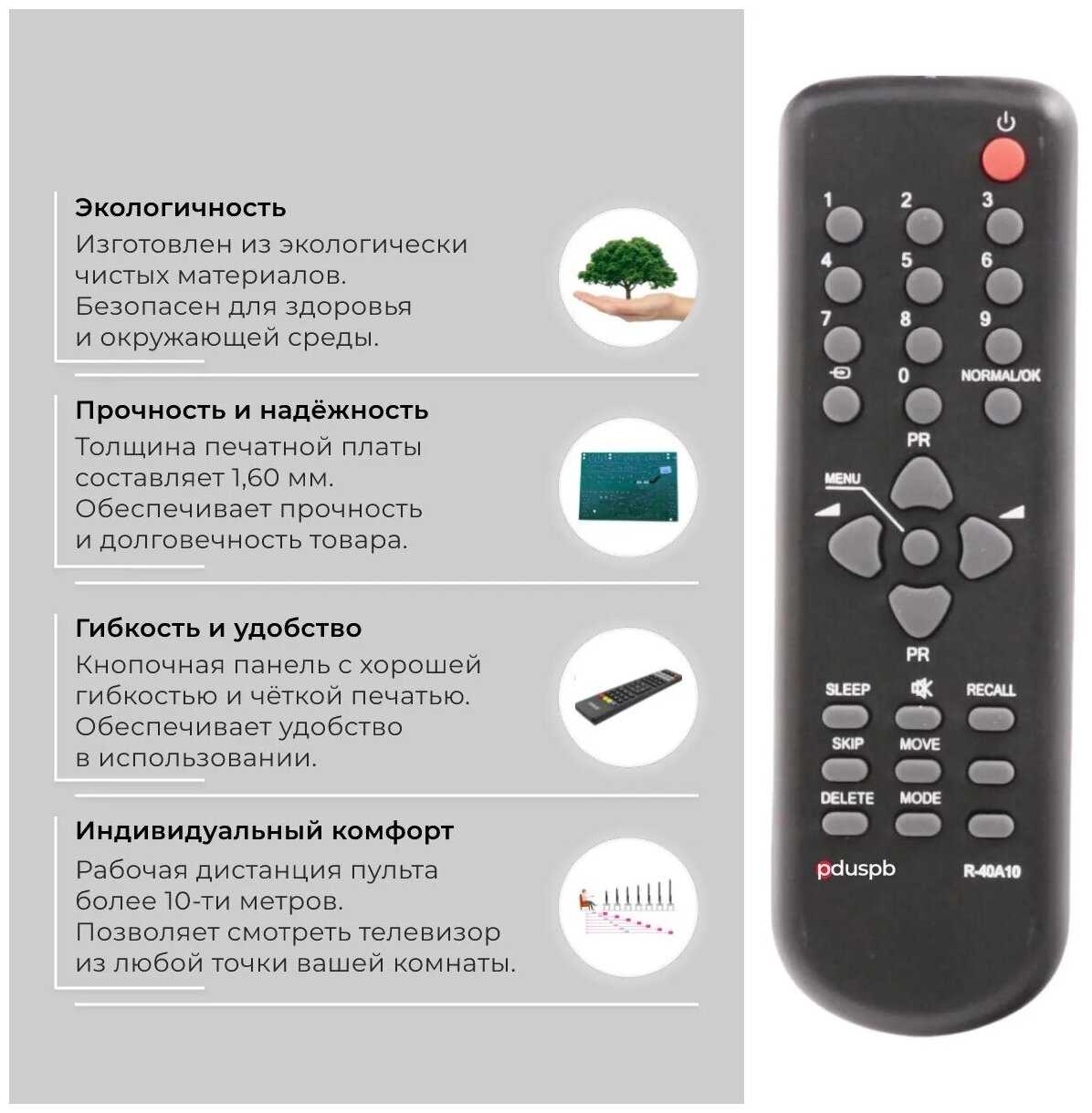 Дополнительная информация : | Внимание! Данный пульт R-40A10 не универсальный. Он совместим только с телевизорами из списка поддерживаемого оборудования! Подробный список поддерживаемого оборудования смотрите в «Назначении». Для Вашего удобства мы также добавили инструкции по подборке пультов. Пожалуйста, ознакомьтесь с ними перед покупкой. Можете задавать вопросы, мы незамедлительно поможем подобрать пульт для Вашего ТВ. |