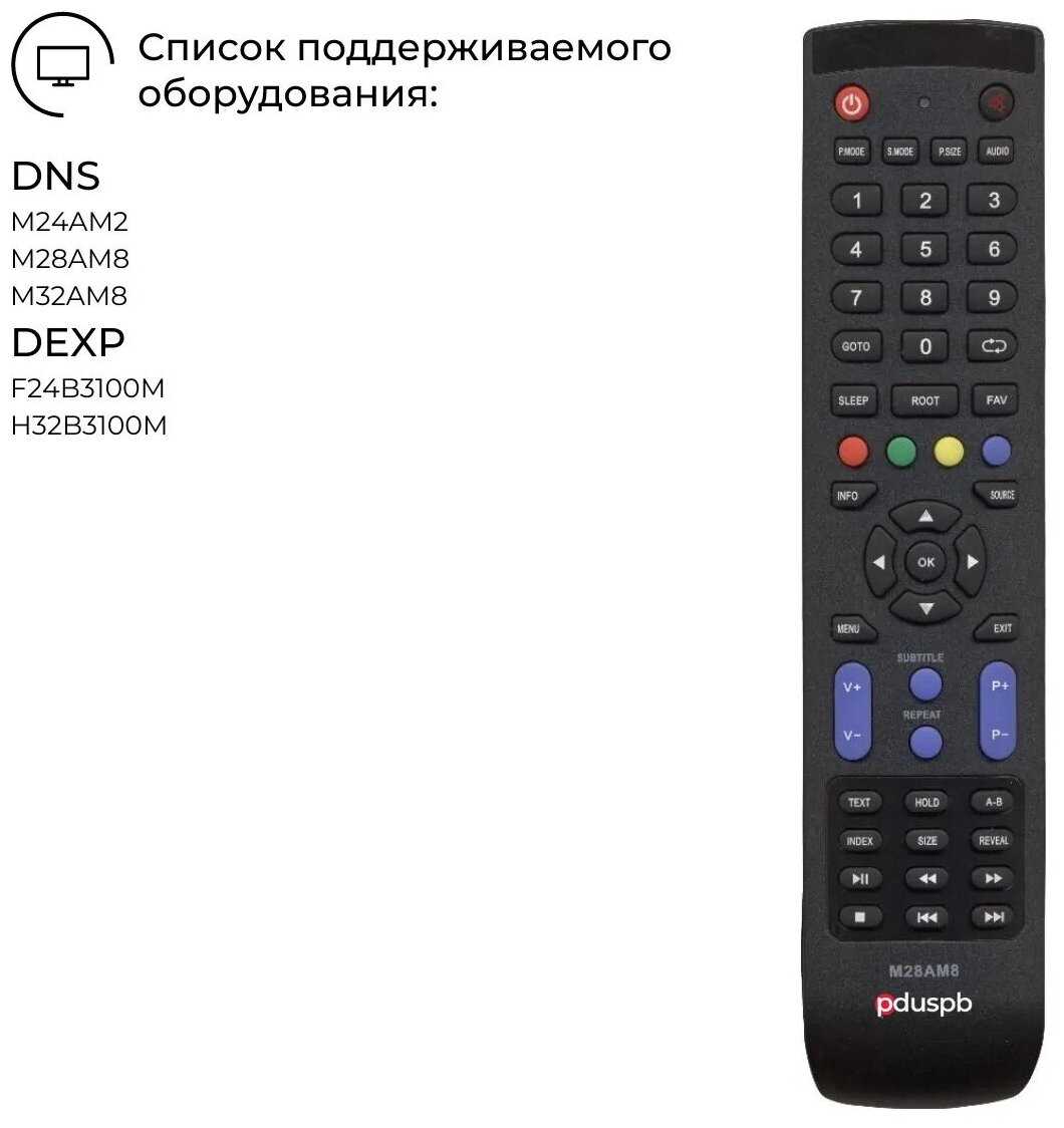 Дополнительная информация : | Внимание! Данный пульт M28AM8 (F24B3100M, M24AM2) не универсальный. Он совместим только с телевизорами из списка поддерживаемого оборудования! Подробный список поддерживаемого оборудования смотрите в «Назначении». Для Вашего удобства мы также добавили инструкции по подборке пультов. Пожалуйста, ознакомьтесь с ними перед покупкой. Можете задавать вопросы, мы незамедлительно поможем подобрать пульт для Вашего ТВ. |