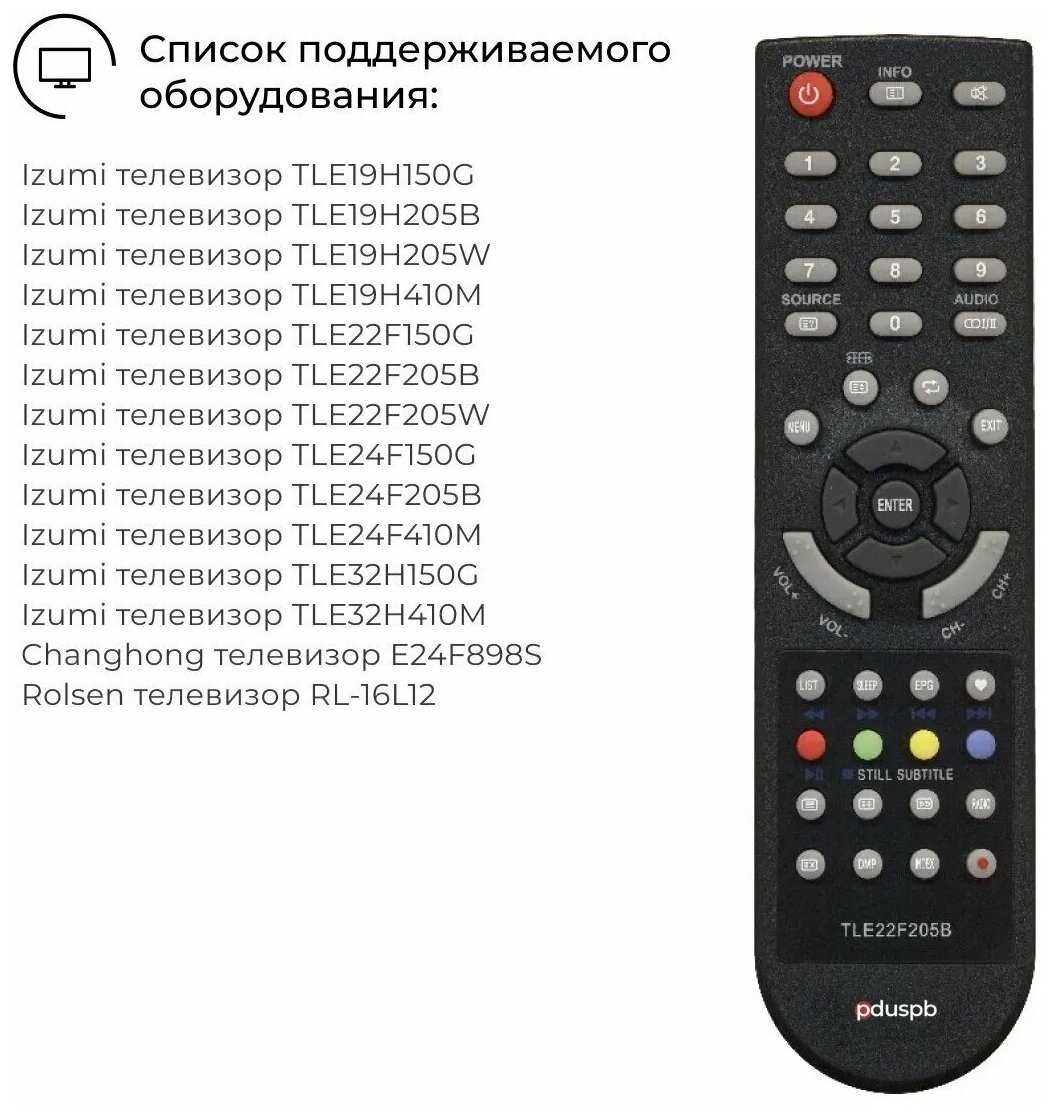 Отзывы о Пульт PDUSPB для Izumi TLE22F205B / Changhong E24F898S / Rolsen RL-16L12 / Telefunken TF-LED32F12T12
