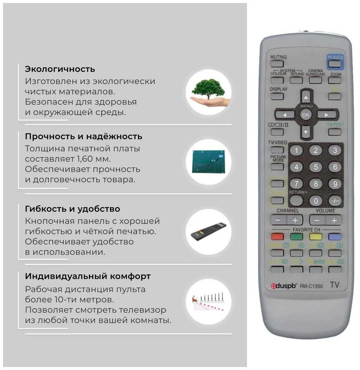 Дополнительная информация : | Внимание! Данный пульт RM-C1350 PIP не универсальный. Он совместим только с телевизорами из списка поддерживаемого оборудования! Подробный список поддерживаемого оборудования смотрите в «Назначении». Для Вашего удобства мы также добавили инструкции по подборке пультов. Пожалуйста, ознакомьтесь с ними перед покупкой. Можете задавать вопросы, мы незамедлительно поможем подобрать пульт для Вашего ТВ. |