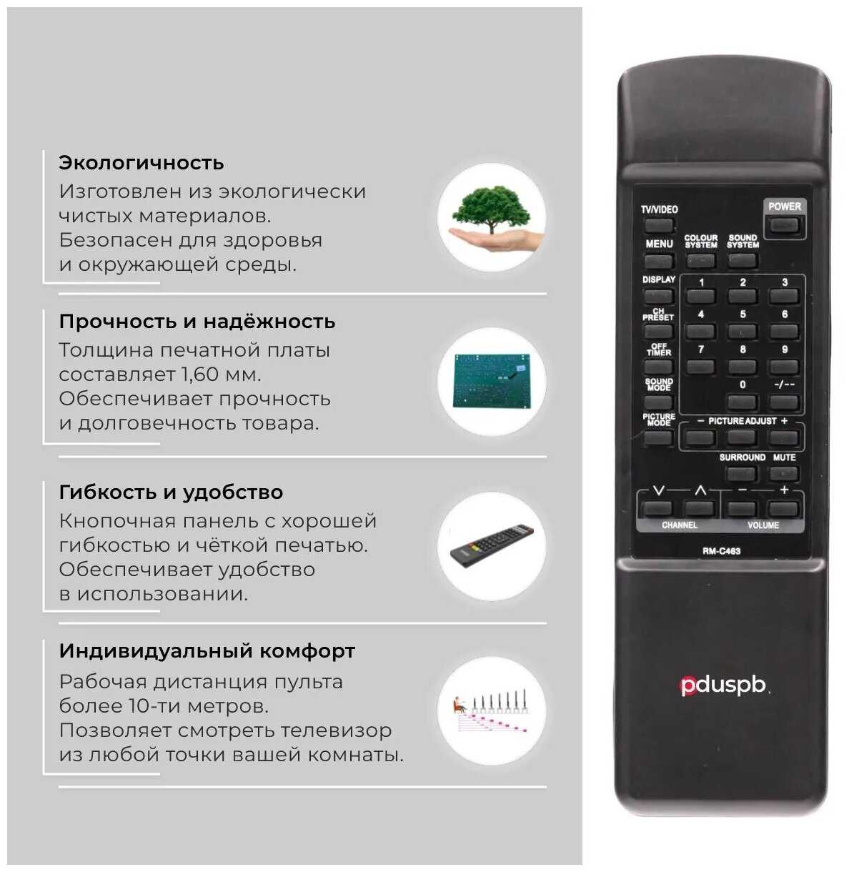 Дополнительная информация : | Внимание! Данный пульт RM-C463 не универсальный. Он совместим только с телевизорами из списка поддерживаемого оборудования! Подробный список поддерживаемого оборудования смотрите в «Назначении». Для Вашего удобства мы также добавили инструкции по подборке пультов. Пожалуйста, ознакомьтесь с ними перед покупкой. Можете задавать вопросы, мы незамедлительно поможем подобрать пульт для Вашего ТВ. |