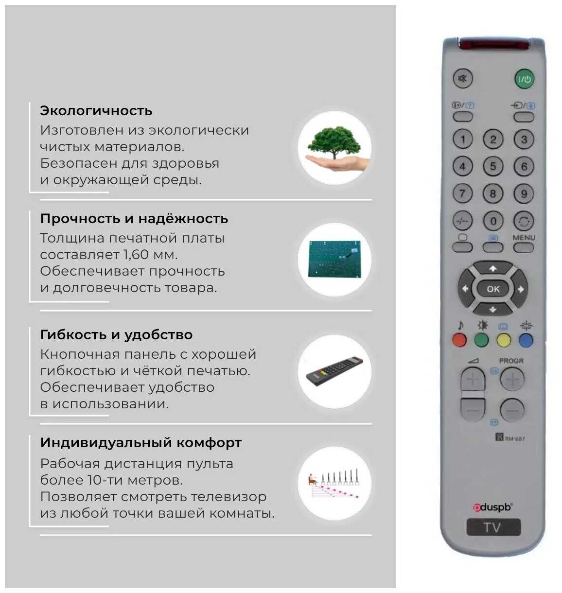 | Дополнительная информация : | Внимание! Данный пульт RM-887/889 не универсальный. Он совместим только с телевизорами из списка поддерживаемого оборудования! Подробный список поддерживаемого оборудования смотрите в «Назначении». Для Вашего удобства мы также добавили инструкции по подборке пультов. Пожалуйста, ознакомьтесь с ними перед покупкой. Можете задавать вопросы, мы незамедлительно поможем подобрать пульт для Вашего ТВ. |