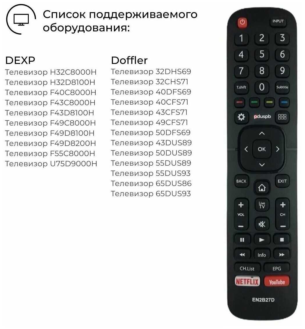 Дополнительная информация : | Внимание! Данный пульт EN2B27DF не универсальный. Он совместим только с телевизорами из списка поддерживаемого оборудования! Подробный список поддерживаемого оборудования смотрите в «Назначении». Для Вашего удобства мы также добавили инструкции по подборке пультов. Пожалуйста, ознакомьтесь с ними перед покупкой. Можете задавать вопросы, мы незамедлительно поможем подобрать пульт для Вашего ТВ. |