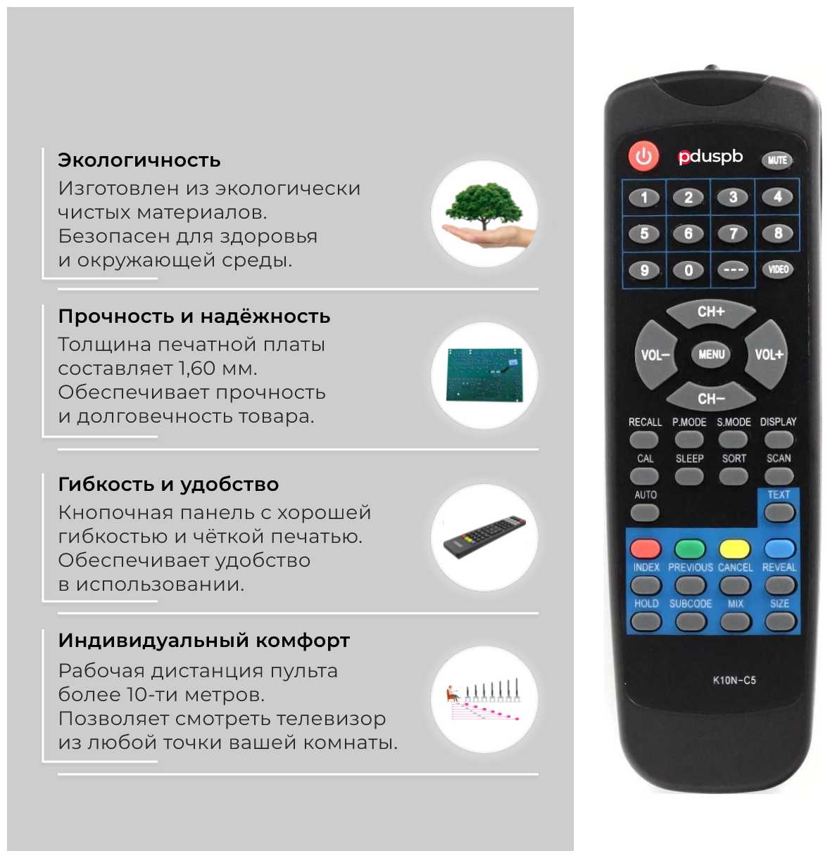 Дополнительная информация : | Внимание! Данный пульт K10N-C5 не универсальный. Он совместим только с телевизорами из списка поддерживаемого оборудования! Подробный список поддерживаемого оборудования смотрите в «Назначении». Для Вашего удобства мы также добавили инструкции по подборке пультов. Пожалуйста, ознакомьтесь с ними перед покупкой. Можете задавать вопросы, мы незамедлительно поможем подобрать пульт для Вашего ТВ. |