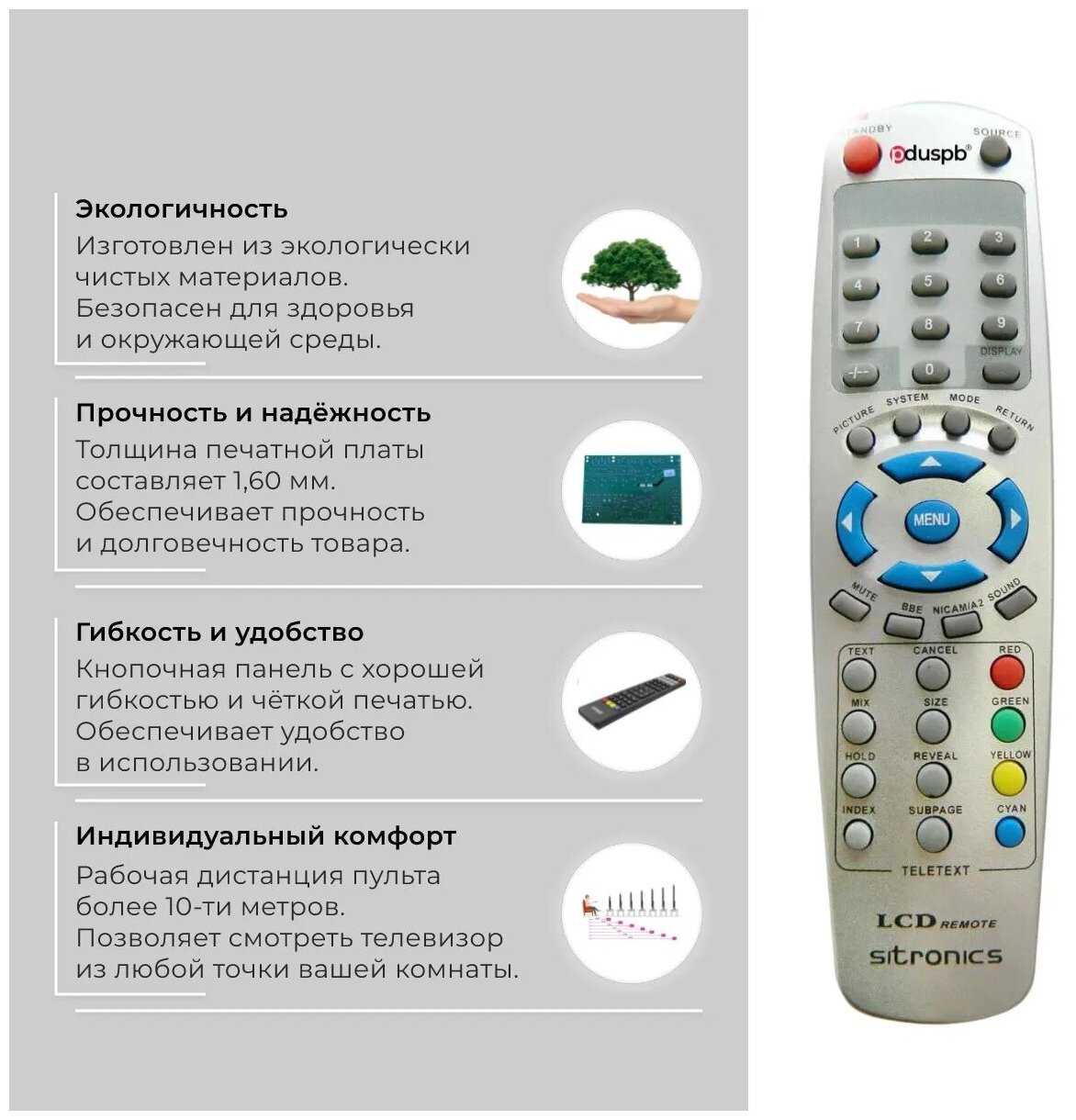 Дополнительная информация : | Внимание! Данный пульт НЕ универсальный. Он совместим только с телевизорами из списка поддерживаемого оборудования! Подробный список поддерживаемого оборудования смотрите в «Назначении». Для Вашего удобства мы также добавили инструкции по подборке пультов. Пожалуйста, ознакомьтесь с ними перед покупкой. Можете задавать вопросы, мы незамедлительно поможем подобрать пульт для Вашего ТВ. |