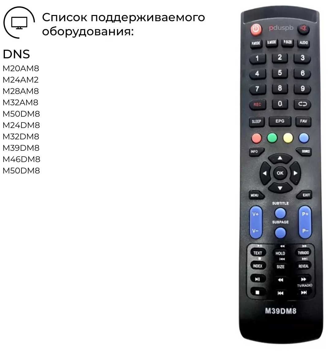 - назначение: для Пульт подходит к телевизорам; DNS M20AM8; DNS M24AM2; DNS M28AM8; DNS M32AM8; DNS M50DM8; DNS M24DM8; DNS M32DM8; DNS M39DM8; DNS M46DM8; DNS M50DM8.