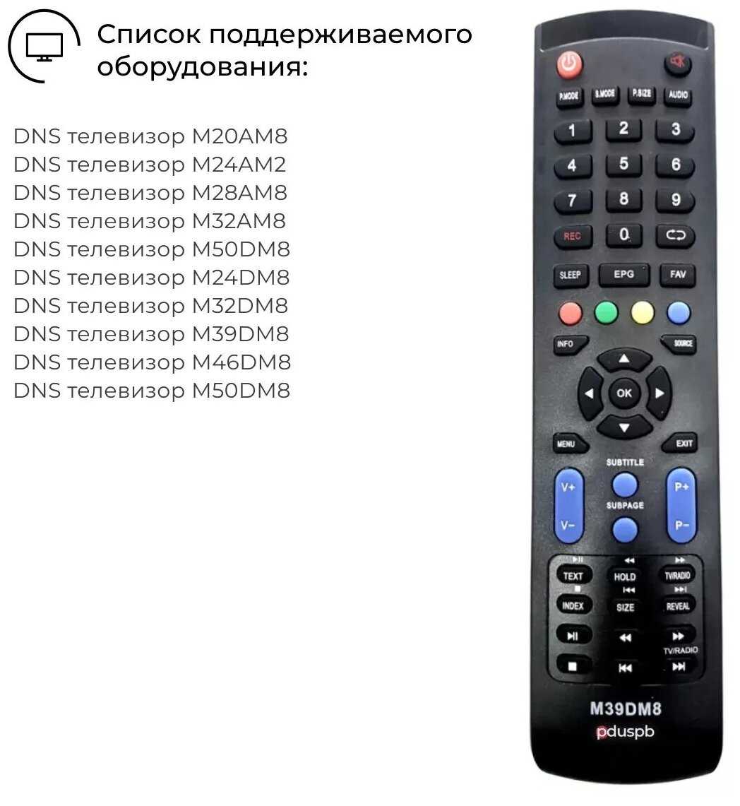 - назначение: для Пульт подходит к телевизорам; DNS M20AM8; DNS M24AM2; DNS M28AM8; DNS M32AM8; DNS M50DM8; DNS M24DM8; DNS M32DM8; DNS M39DM8; DNS M46DM8; DNS M50DM8.