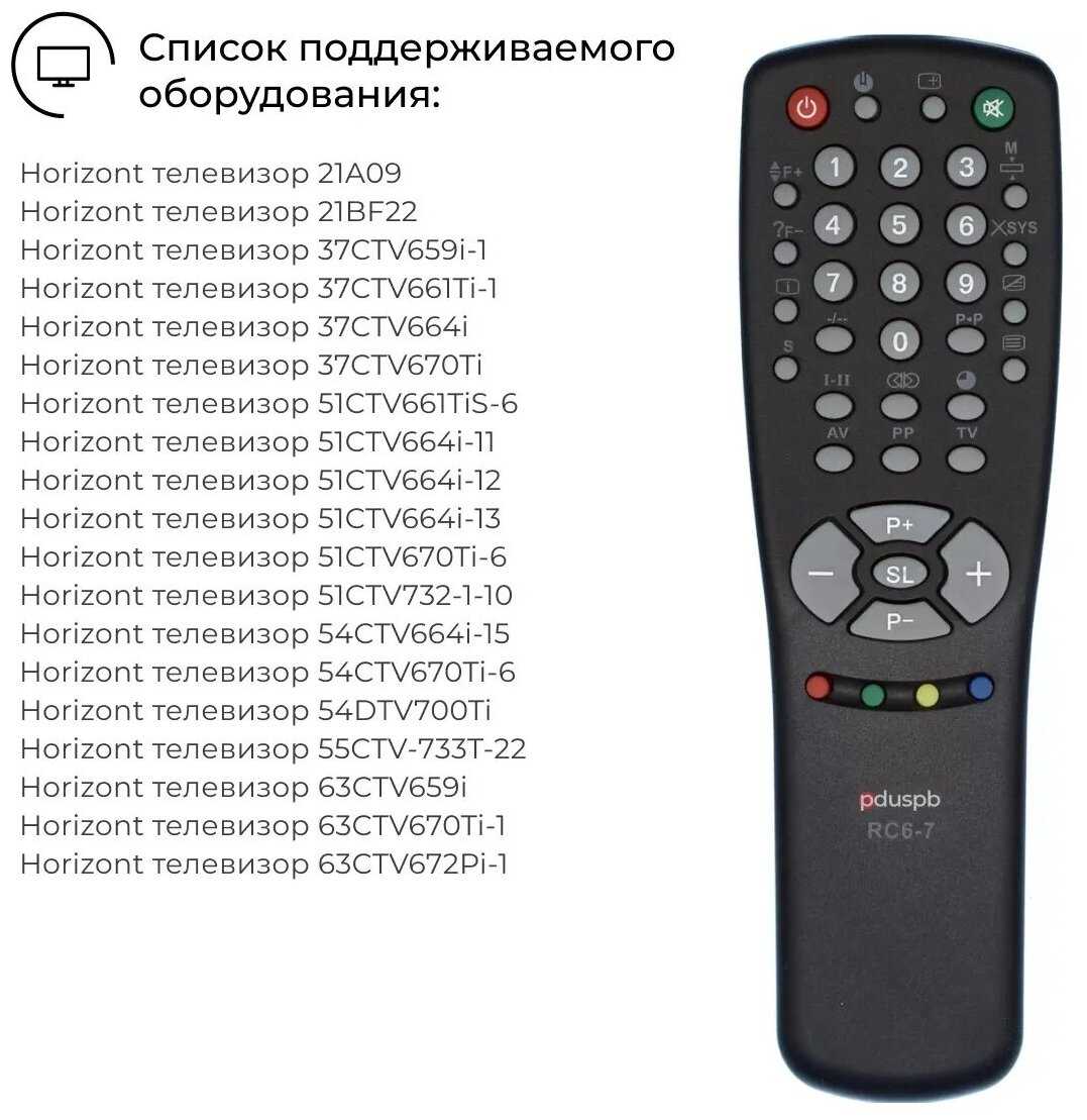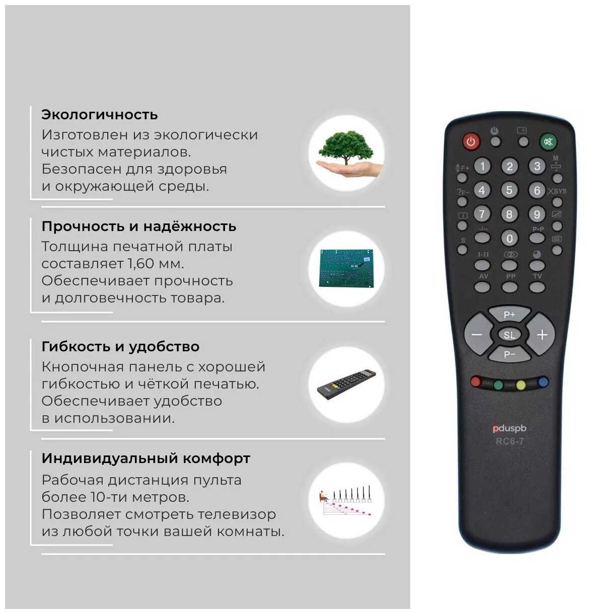 | Дополнительная информация : | Внимание! Данный пульт RC-6-7 не универсальный. Он совместим только с телевизорами из списка поддерживаемого оборудования! Подробный список поддерживаемого оборудования смотрите в «Назначении». Для Вашего удобства мы также добавили инструкции по подборке пультов. Пожалуйста, ознакомьтесь с ними перед покупкой. Можете задавать вопросы, мы незамедлительно поможем подобрать пульт для Вашего ТВ. |