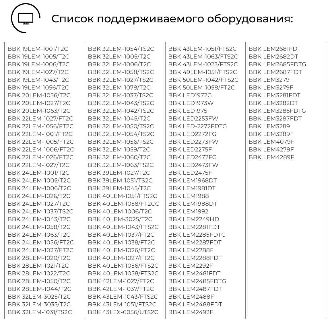 - назначение: для 19LEM-1001/T2C; 19LEM-1005/T2C; 19LEM-1006/T2C; 19LEM-1027/T2C; 19LEM-1043/T2C; 19LEM-1056/T2C; 20LEM-1056/T2C; 20LEM-1027/T2C; 20LEM-1063/T2C; 22LEM-1027/FT2C; 22LEM-1056/FT2C; 22LEM-1001/FT2C; 22LEM-1005/FT2C; 22LEM-1006/FT2C; 22LEM-1026/FT2C; 22LEM-1027/T2C; 24LEM-1001/T2C; 24LEM-1005/T2C; 24LEM-1006/T2C; 24LEM-1026/T2C; 24LEM-1027/T2C; 24LEM-1037/TS2C; 24LEM-1043/T2C; 24LEM-1058/T2C; 24LEM-1063/T2C; 24LEM-1056/FT2C; 24LEM-1027/FT2C; 28LEM-1020/T2C; 28LEM-1021/T2C; 28LEM-1022/T2C; 28LEM-1050/T2C; 28LEM-1044/T2C; 32LEM-3025/T2C; 32LEM-3035/T2C; 32LEM-1031/TS2C; 32LEM-1054/TS2C; 32LEM-1005/T2C; 32LEM-1006/T2C; 32LEM-1058/TS2C; 32LEM-1027/TS2C; 32LEM-1078/T2C; 32LEM-1037/TS2C; 32LEM-1043/TS2C; 32LEM-1042/TS2C; 32LEM-1045/T2C; 32LEM-1050/TS2C; 32LEM-1054/TS2C; 32LEM-1056/TS2C; 32LEM-1059/T2C; 32LEM-1060/T2C; 32LEM-1063/TS2C; 39LEM-1027/T2C; 39LEM-1051/TS2C; 39LEM-1045/T2C; 40LEM-1051/FTS2C; 40LEM-1058/FT2CC; 40LEM-1006/T2C; 40LEM-3025/T2C; 40LEM-1043/FTS2C; 40LEM-1037/FT2C; 40LEM-1038/FT2C; 40LEM-1026/FT2C; 40LEM-1027/FT2C; 40LEM-1056/FTS2C; 40LEM-1058/FTS2C; 42LEM-1027/FT2C; 42LEM-1037/FT2C; 43LEM-1043/FTS2C; 43LEM-1051/FTS2C; 43LEX-6056/UTS2C; 43LEM-1051/FTS2C; 43LEM-1063/FTS2C; 43LEM-1023/FTS2C; 49LEM-1051/FTS2C; 50LEM-1042/FTS2C; 50LEM-1058/FT2C; LED1972G; LED1973W; LED1975; LED2253FW; LED-2272FDTG; LED2272FG; LED2273FW; LED2275F; LED2472FG; LED2473FW; LED2475F; LEM1968DT; LEM1981DT; LEM1988; LEM1988DT; LEM1992; LEM2249HD; LEM2281FDT; LEM2285FDTG; LEM2287FDT; LEM2288F; LEM2288FDT; LEM2292F; LEM2481FDT; LEM2485FDTG; LEM2487FDT; LEM2488F; LEM2488FDT; LEM2492F; LEM2681FDT; LEM2682DT; LEM2685FDTG; LEM2687FDT; LEM3279; LEM3279F; LEM3281FDT; LEM3282DT; LEM3285FDTG; LEM3287FDT; LEM3289; LEM3289F; LEM4079F; LEM4279F; LEM4289F;