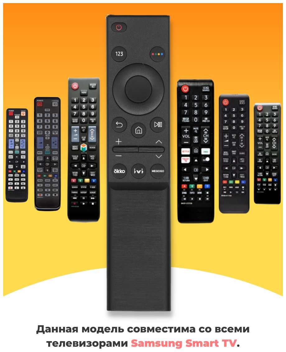 | Дополнительная информация : | Данная модель BN59-01358F совместима со всеми современными ЖК телевизорами Samsung. Все пульты в подобном классическом корпусе совместимы и взаимозаменяемы. Разница лишь в дополнительных кнопках на пульте. Подробный список поддерживаемого оборудования смотрите в «Назначении». Для Вашего удобства мы также добавили инструкции по подборке пультов. Пожалуйста, ознакомьтесь с ними перед покупкой. Можете задавать вопросы, мы незамедлительно поможем подобрать пульт для Вашего ТВ |
