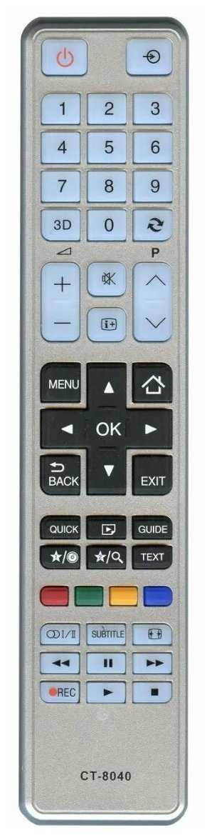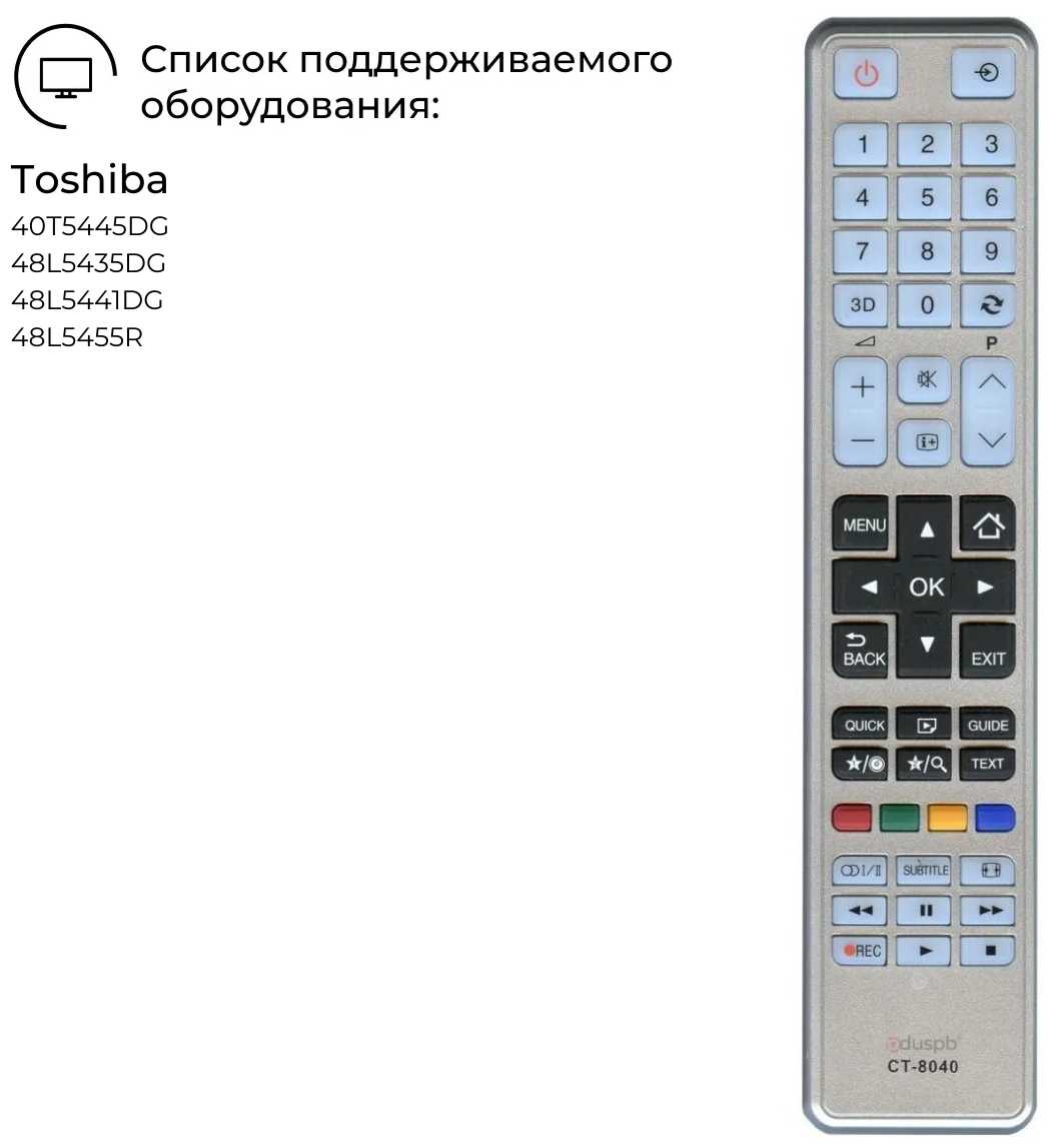 | Назначение : | Пульт CT-8040 подходит к телевизорам Toshiba: 40T5445DG, 48L5435DG, 48L5441DG, 48L5455R |